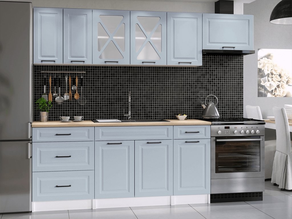 Kuchyňská linka Magda je vyrobená ve venkovském stylu, který se hodí do kuchyně v paneláku i v rodinném domě. Tento styl má jedinečnou schopnost proměnit Vaši kuchyň v útulnou a zároveň funkční místnost, kde bude radost vařit i péct. Kuchyňská linka Magda nabízí dostatek úložného i pracovního prostoru. Všechny skříňky jsou samostatné, takže si je můžete sestavit tak, jak Vám to vyhovuje. Korpusy skříněk jsou vyrobené z lamina 18 mm s hranami ABS a dvířka jsou MDF 16mm. Všechny skříňky jsou dodávány v demontu. Součástí balení je montážní plánek včetně všech potřebných spojovacích prvků. Cena je uvedna za sestavu vyobrazenou na úvodní fotografii BEZ PRACOVNÍ DESKY, s úchytkami, které jsou vyobrazeny v doplňkových fotografiích. Pracovní desku lze dokoupit nad každou skříňku zvlášť podle její šíře. Vyobrazené spotřebiče, dřez, baterie, doplňky a dekorace nejsou v ceně. Kuchyň bude dodaná s bílými korpusy a dvířky ve světle modré barvě.