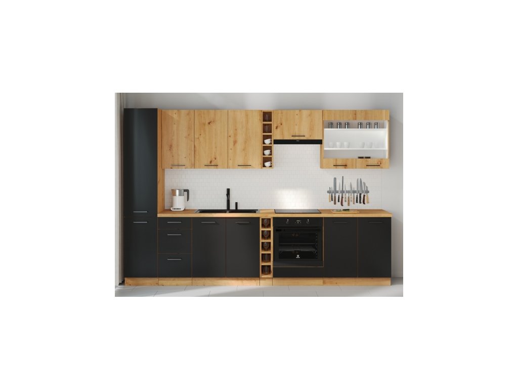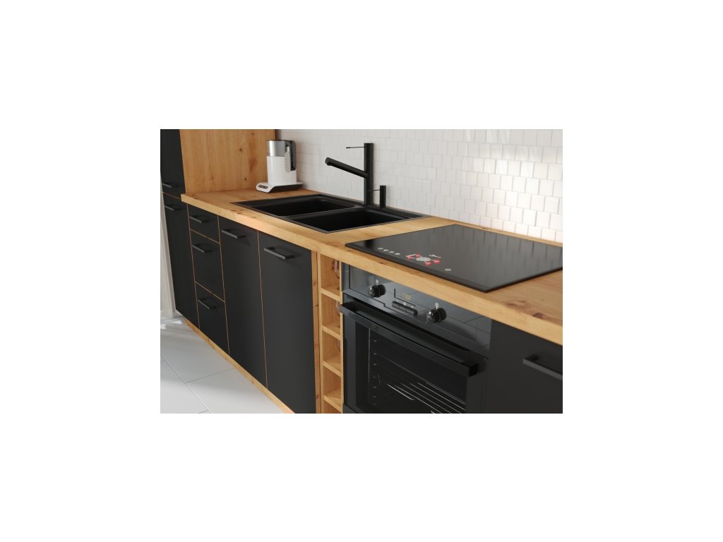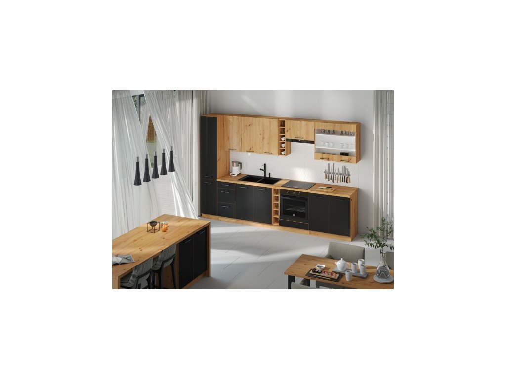 Moderní sektorová kuchyňská linka Modena, která je v atraktivním designu a je tak ideální volbou při výběru Vaší kuchyně. Linka má korpus a dvířka horních skříněk v odstínu dubu Artisan a dvířka spodních skříněk v černém matu. U skříněk s výklopem se dvířka zvedají pomocí plynových pístů, Cargo skříňky jsou výsuvné, všechny ostatní skříňky (mimo rohových) a zásuvky jsou opatřeny SYSTÉMEM TICHÉHO DOVÍRÁNÍ. Úchytky jsou kovové.