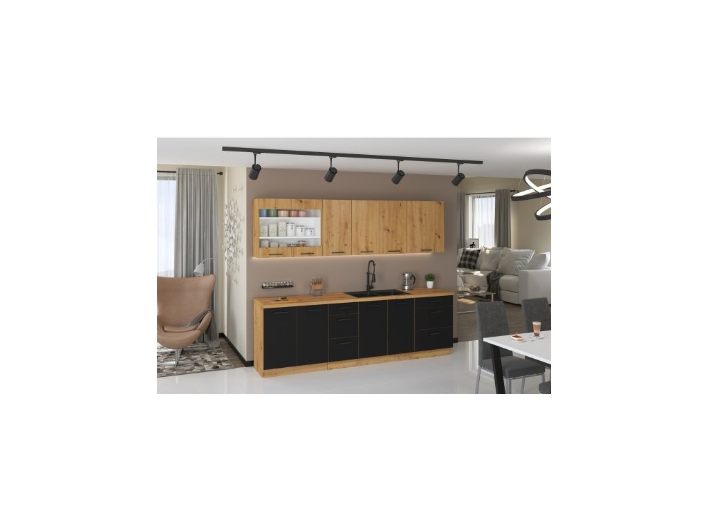 Moderní sektorová kuchyňská linka Modena, která je v atraktivním designu a je tak ideální volbou při výběru Vaší kuchyně. Linka má korpus a dvířka horních skříněk v odstínu dubu Artisan a dvířka spodních skříněk v černém matu. U skříněk s výklopem se dvířka zvedají pomocí plynových pístů, Cargo skříňky jsou výsuvné, všechny ostatní skříňky (mimo rohových) a zásuvky jsou opatřeny SYSTÉMEM TICHÉHO DOVÍRÁNÍ. Úchytky jsou kovové.