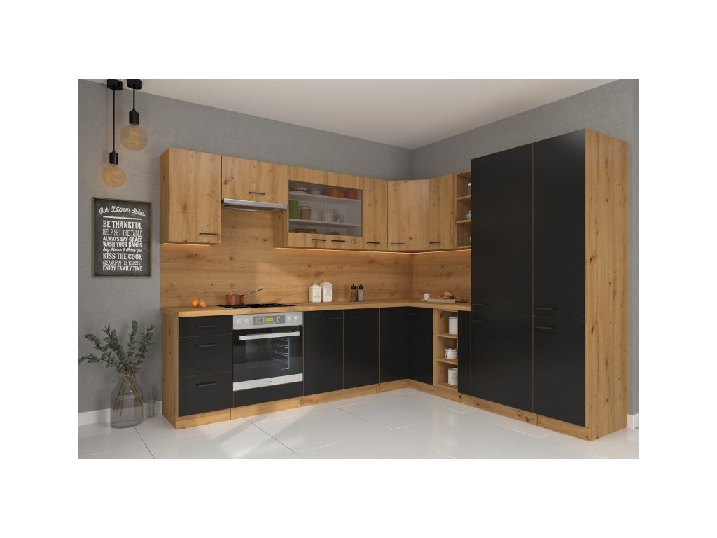 Moderní sektorová kuchyňská linka Modena, která je v atraktivním designu a je tak ideální volbou při výběru Vaší kuchyně. Linka má korpus a dvířka horních skříněk v odstínu dubu Artisan a dvířka spodních skříněk v černém matu. U skříněk s výklopem se dvířka zvedají pomocí plynových pístů, Cargo skříňky jsou výsuvné, všechny ostatní skříňky (mimo rohových) a zásuvky jsou opatřeny SYSTÉMEM TICHÉHO DOVÍRÁNÍ. Úchytky jsou kovové.