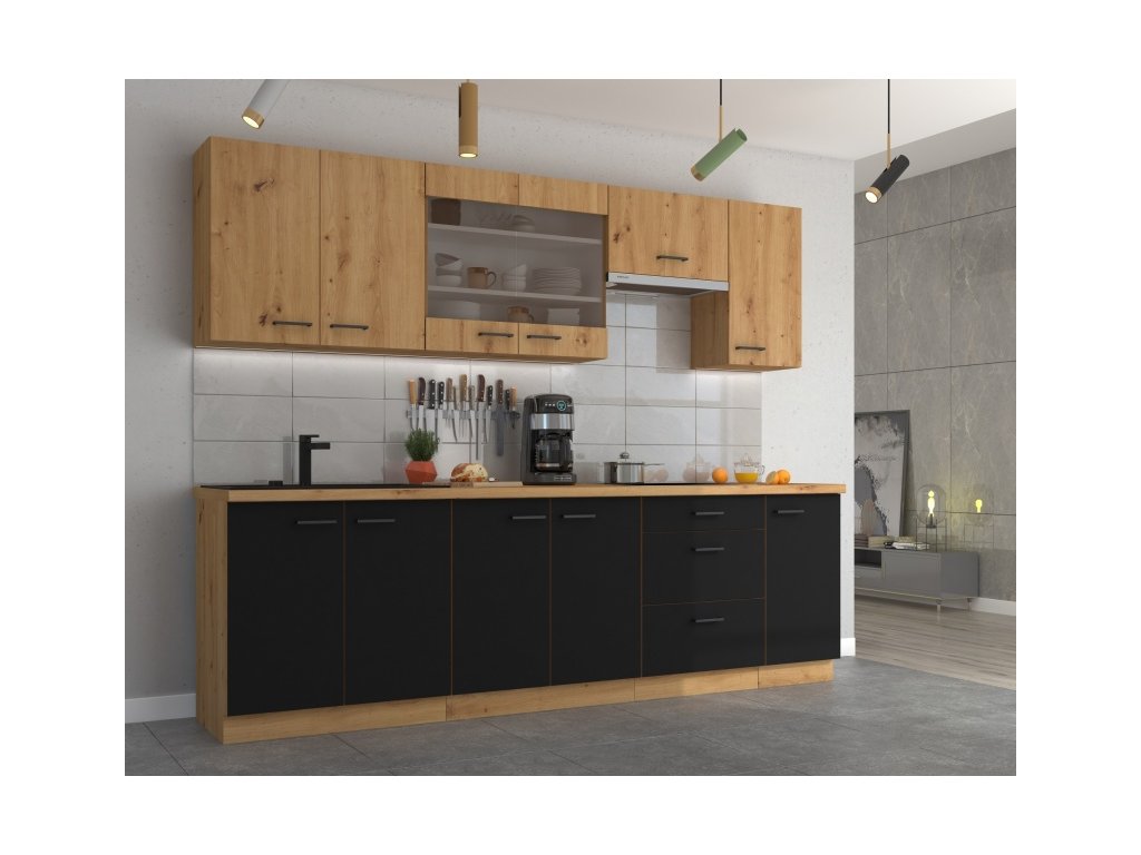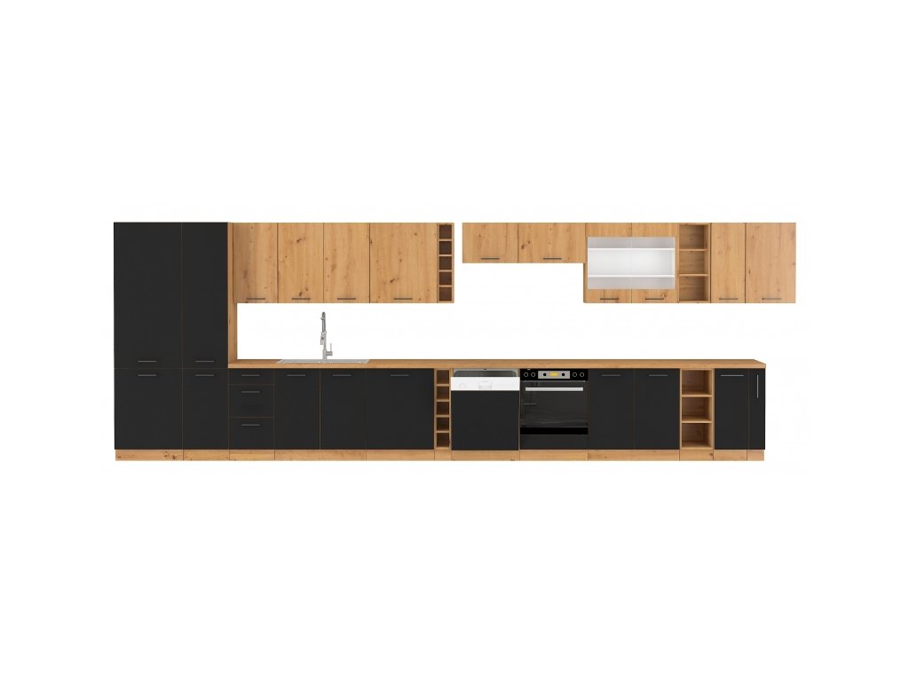 Moderní sektorová kuchyňská linka Modena, která je v atraktivním designu a je tak ideální volbou při výběru Vaší kuchyně. Linka má korpus a dvířka horních skříněk v odstínu dubu Artisan a dvířka spodních skříněk v černém matu. U skříněk s výklopem se dvířka zvedají pomocí plynových pístů, Cargo skříňky jsou výsuvné, všechny ostatní skříňky (mimo rohových) a zásuvky jsou opatřeny SYSTÉMEM TICHÉHO DOVÍRÁNÍ. Úchytky jsou kovové.