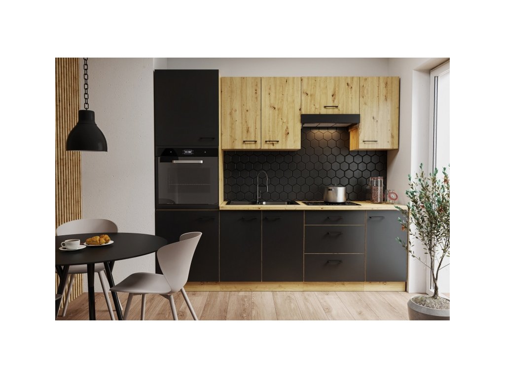 Moderní sektorová kuchyňská linka Modena, která je v atraktivním designu a je tak ideální volbou při výběru Vaší kuchyně. Linka má korpus a dvířka horních skříněk v odstínu dubu Artisan a dvířka spodních skříněk v černém matu. U skříněk s výklopem se dvířka zvedají pomocí plynových pístů, Cargo skříňky jsou výsuvné, všechny ostatní skříňky (mimo rohových) a zásuvky jsou opatřeny SYSTÉMEM TICHÉHO DOVÍRÁNÍ. Úchytky jsou kovové.