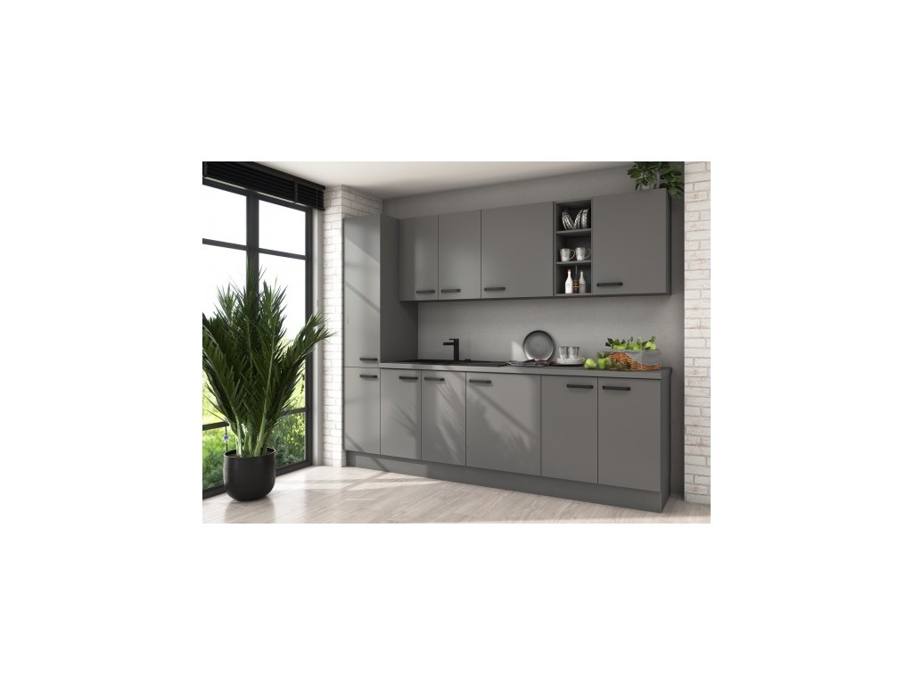 Moderní kuchyňská linka v barevném provedení Antracit (korpus) a Antracit (dvířka). Tato linka má atraktivní design díky moderním výškově nastavitelným nožkám a je tak ideální volbou při výběru Vaší kuchyně. U skříněk s výklopem se dvířka zvedají pomocí plynových pístů, Cargo skříňky jsou výsuvné, všechny ostatní skříňky (mimo rohových) a zásuvky jsou opatřeny SYSTÉMEM TICHÉHO DOVÍRÁNÍ.