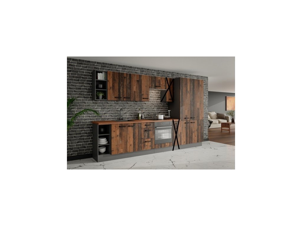 Moderní kuchyňská linka v barevném provedení Antracit (korpus) a OldStyle (dvířka). Tato linka má atraktivní design díky moderním výškově nastavitelným nožkám a je tak ideální volbou při výběru Vaší kuchyně. U skříněk s výklopem se dvířka zvedají pomocí plynových pístů, Cargo skříňky jsou výsuvné, všechny ostatní skříňky (mimo rohových) a zásuvky jsou opatřeny SYSTÉMEM TICHÉHO DOVÍRÁNÍ. Úchytky jsou kovové.