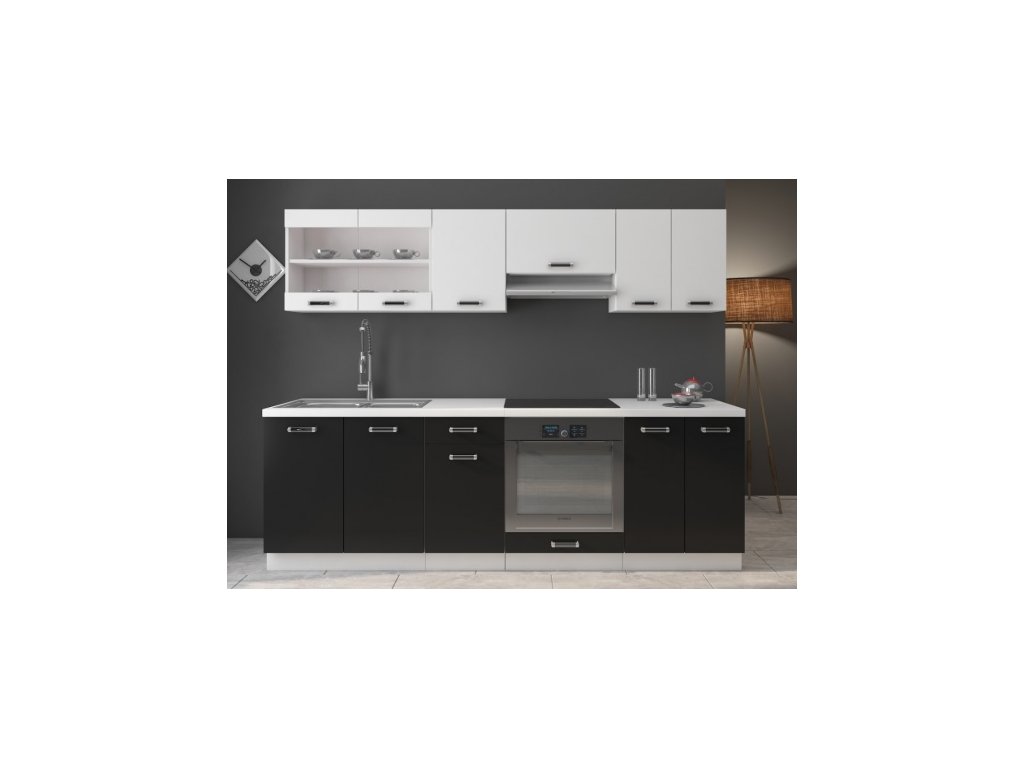 Moderní sektorová kuchyňská linka Omega má atraktivní design a je tak ideální volbou při výběru Vaší kuchyně. Linka má korpus a dvířka horních skříněk v bílém matu, dvířka dolních skříněk jsou matu černém. U skříněk s výklopem se dvířka zvedají pomocí plynových pístů, úchytky jsou plastové.