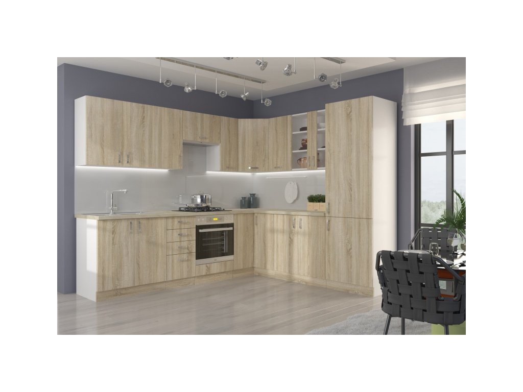Moderní kuchyňská linka v barevném provedení bílé (korpus) a dubu Sonoma (dvířka). Tato linka má atraktivní design a je tak ideální volbou při výběru Vaší kuchyně. U skříněk s výklopem se dvířka zvedají pomocí plynových pístů, úchytky jsou plastové.