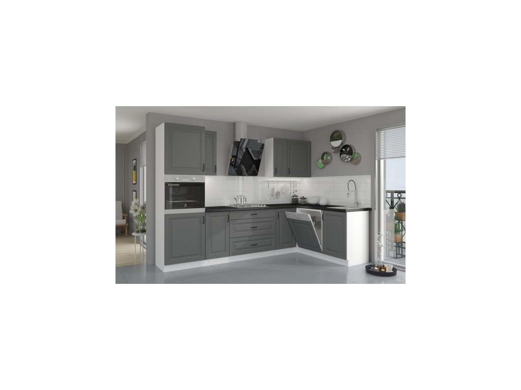 Moderní kuchyňská linka v barevném provedení bílý mat (korpus) a MDF Dust Grey mat (dvířka s prolisy). Tato linka má atraktivní design a je tak ideální volbou při výběru Vaší kuchyně. U skříněk s výklopem se dvířka zvedají pomocí plynových pístů, Cargo skříňky jsou výsuvné, všechny ostatní skříňky (mimo rohových) a zásuvky jsou opatřeny SYSTÉMEM TICHÉHO DOVÍRÁNÍ. Úchytky jsou kovové.