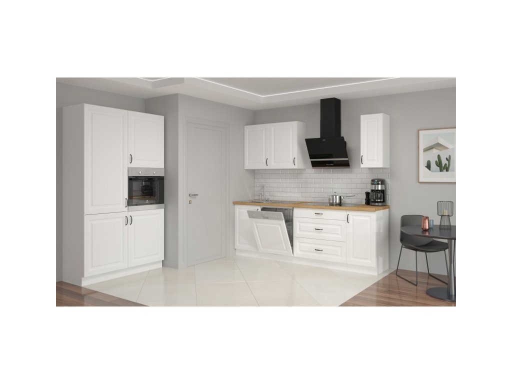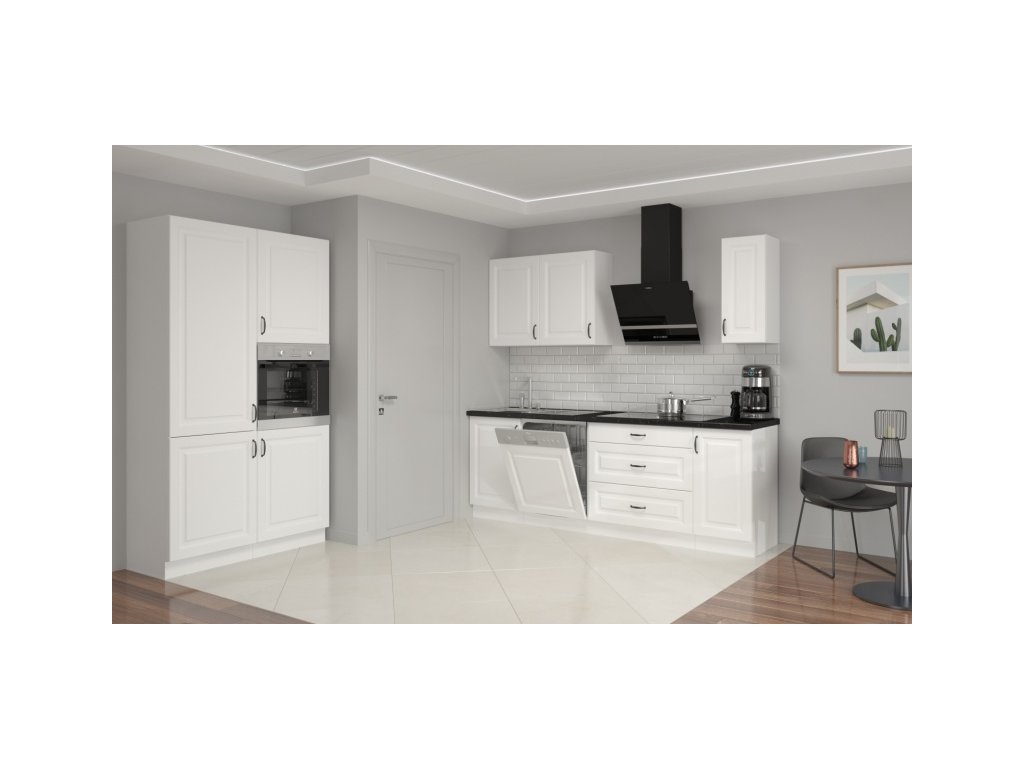 Moderní kuchyňská linka v barevném provedení bílý mat (korpus) a MDF bílý mat (dvířka s prolisy). Tato linka má atraktivní design a je tak ideální volbou při výběru Vaší kuchyně. U skříněk s výklopem se dvířka zvedají pomocí plynových pístů, Cargo skříňky jsou výsuvné, všechny ostatní skříňky (mimo rohových) a zásuvky jsou opatřeny SYSTÉMEM TICHÉHO DOVÍRÁNÍ. Úchytky jsou kovové.