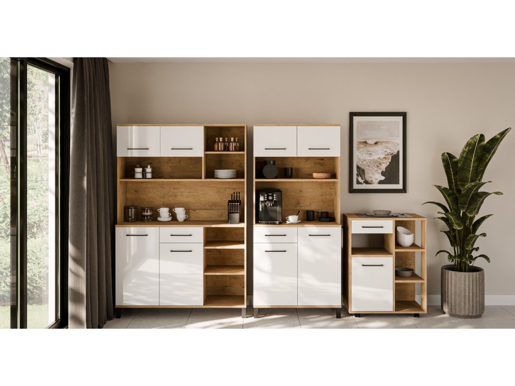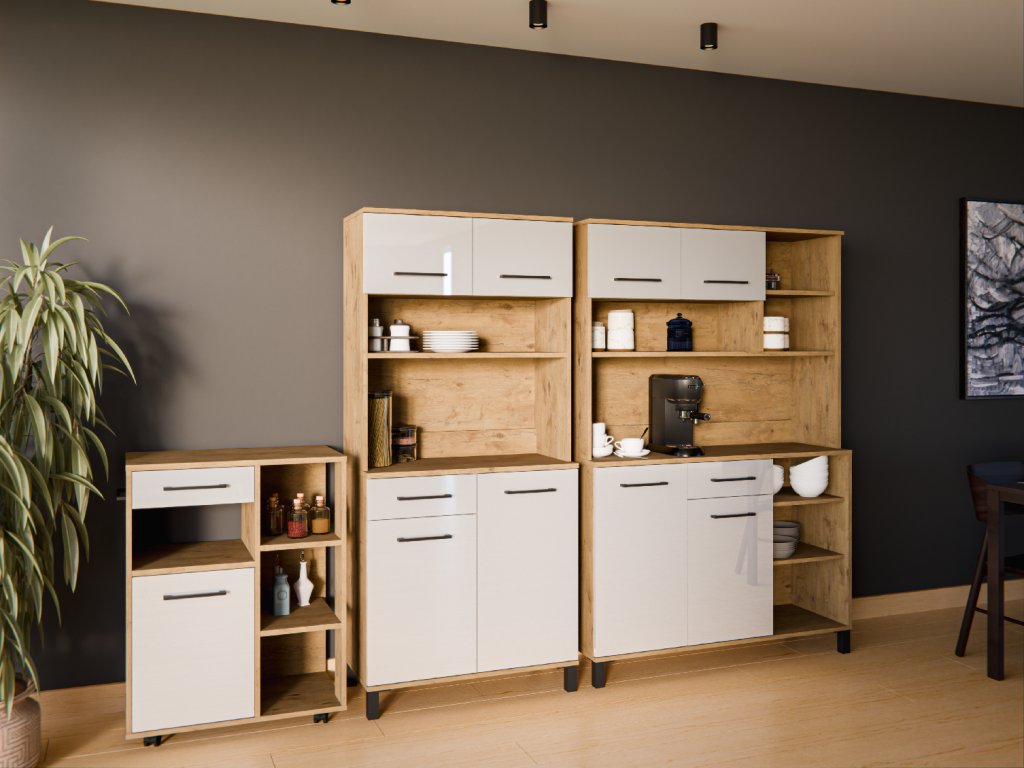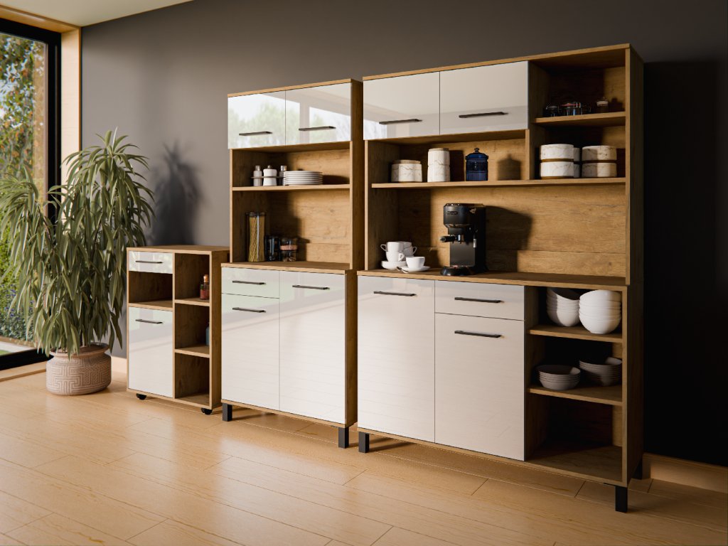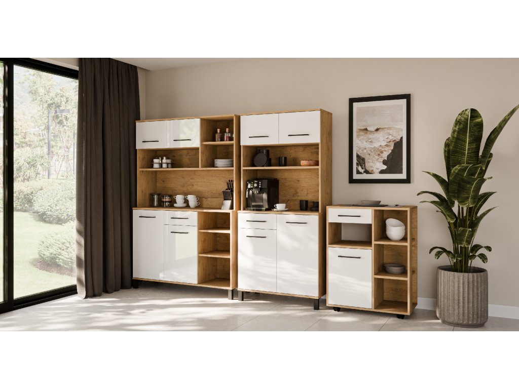 je součástí moderní sektorové kuchyňské linky Vigo bílý lesk a součástí praktických kredenců. Sestava je vhodná do domácností i do kanceláří a nabízí prostor pro uložení nádobí, mikrovlnnou troubu či kávovar. Obsahujem této sestavy je i servírovací stolek, který lze dle Vaší potřeby přemístit z jedné místnosti do místnosti druhé.