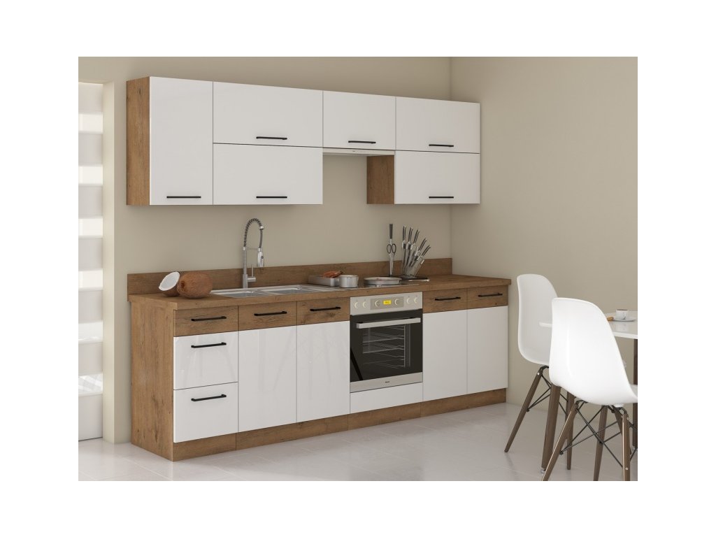 Moderní kuchyňská linka v barevném provedení dub Lancelot (korpus) a bílý lesk (dvířka). Tato linka má atraktivní design a je tak ideální volbou při výběru Vaší kuchyně. U skříněk s výklopem se dvířka zvedají pomocí plynových pístů, Cargo skříňky jsou výsuvné, všechny ostatní skříňky (mimo rohových) a zásuvky jsou opatřeny SYSTÉMEM TICHÉHO DOVÍRÁNÍ. Úchytky jsou kovové.