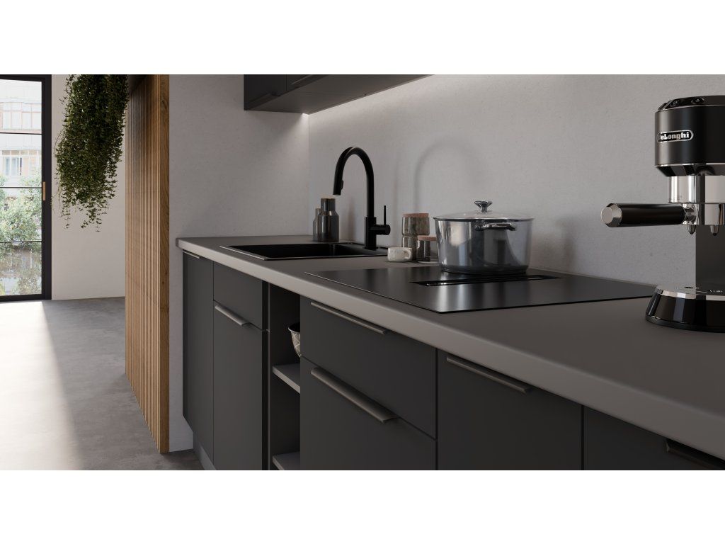 je součástí moderní sektorové kuchyňské linky Aria BL/ANT, která je v barevném provedení Antracit (korpus) a černý mat (dvířka). Tato linka má atraktivní design díky moderním výškově nastavitelným nožkám a je tak ideální volbou při výběru Vaší kuchyně. U skříněk s výklopem se dvířka zvedají pomocí plynových pístů, Cargo skříňky jsou výsuvné, všechny ostatní skříňky (mimo rohových) a zásuvky jsou opatřeny SYSTÉMEM TICHÉHO DOVÍRÁNÍ. Úchytky jsou hliníkové černé. Na předních stranách tohoto nábytku (dvířka/zásuvky) má linka speciální povrchovou úpravu Anti Finger Print, nezanechávající otisky prstů.