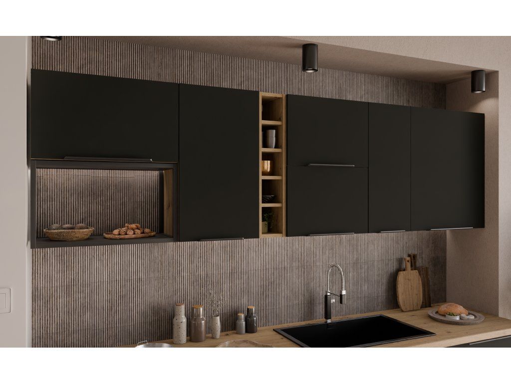 je součástí moderní sektorové kuchyňské linky Aria BL-AR, která je v barevném provedení dub Artisan (korpus) a černý mat (dvířka). U skříněk s výklopem se dvířka zvedají pomocí plynových pístů, Cargo skříňky jsou výsuvné, všechny ostatní skříňky (mimo rohových) a zásuvky jsou opatřeny SYSTÉMEM TICHÉHO DOVÍRÁNÍ. Úchytky jsou hliníkové černé. Na předních stranách tohoto nábytku (dvířka/zásuvky) má linka speciální povrchovou úpravu Anti Finger Print, nezanechávající otisky prstů.