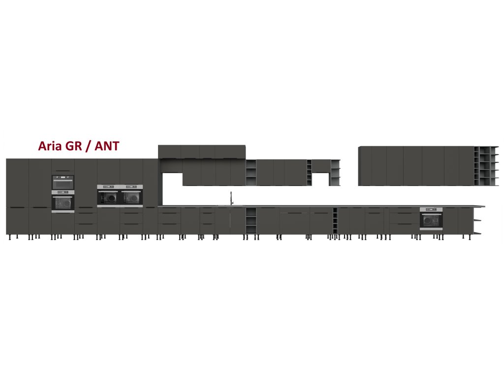 je součástí moderní sektorové kuchyňské linky Aria GR/ANT, která je v barevném provedení Antracit (korpus) a Graphite (dvířka). Tato linka má atraktivní design díky moderním výškově nastavitelným nožkám a je tak ideální volbou při výběru Vaší kuchyně. U skříněk s výklopem se dvířka zvedají pomocí plynových pístů, Cargo skříňky jsou výsuvné, všechny ostatní skříňky (mimo rohových) a zásuvky jsou opatřeny SYSTÉMEM TICHÉHO DOVÍRÁNÍ. Úchytky jsou hliníkové černé. Na předních stranách tohoto nábytku (dvířka/zásuvky) má linka speciální povrchovou úpravu Anti Finger Print, nezanechávající otisky prstů.