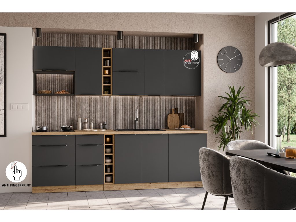 je součástí moderní sektorové kuchyňské linky Aria GR-AR, která je v barevném provedení dub Artisan (korpus) a Graphite (dvířka). U skříněk s výklopem se dvířka zvedají pomocí plynových pístů, Cargo skříňky jsou výsuvné, všechny ostatní skříňky (mimo rohových) a zásuvky jsou opatřeny SYSTÉMEM TICHÉHO DOVÍRÁNÍ. Úchytky jsou hliníkové černé. Na předních stranách tohoto nábytku (dvířka/zásuvky) má linka speciální povrchovou úpravu Anti Finger Print, nezanechávající otisky prstů.