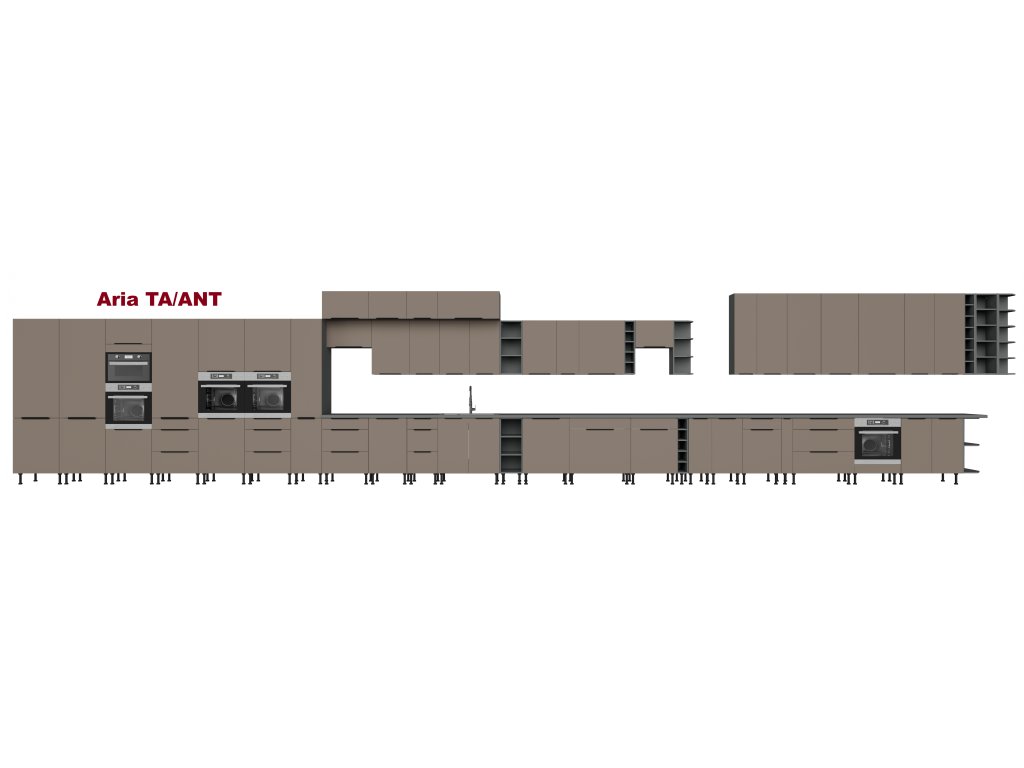 je součástí moderní sektorové kuchyňské linky Aria TA/ANT, která je v barevném provedení Antracit (korpus) a Sandgrau (dvířka). Tato linka má atraktivní design díky moderním výškově nastavitelným nožkám a je tak ideální volbou při výběru Vaší kuchyně. U skříněk s výklopem se dvířka zvedají pomocí plynových pístů, Cargo skříňky jsou výsuvné, všechny ostatní skříňky (mimo rohových) a zásuvky jsou opatřeny SYSTÉMEM TICHÉHO DOVÍRÁNÍ. Úchytky jsou hliníkové černé. Na předních stranách tohoto nábytku (dvířka/zásuvky) má linka speciální povrchovou úpravu Anti Finger Print, nezanechávající otisky prstů.