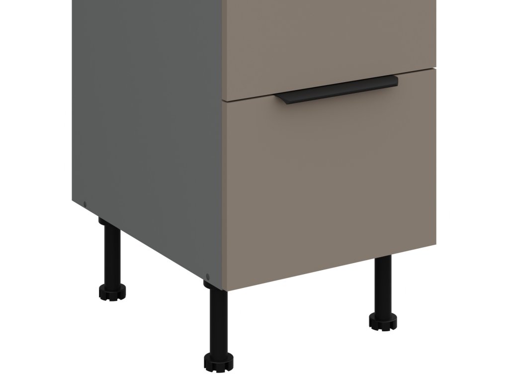 je součástí moderní sektorové kuchyňské linky Aria TA/ANT, která je v barevném provedení Antracit (korpus) a Sandgrau (dvířka). Tato linka má atraktivní design díky moderním výškově nastavitelným nožkám a je tak ideální volbou při výběru Vaší kuchyně. U skříněk s výklopem se dvířka zvedají pomocí plynových pístů, Cargo skříňky jsou výsuvné, všechny ostatní skříňky (mimo rohových) a zásuvky jsou opatřeny SYSTÉMEM TICHÉHO DOVÍRÁNÍ. Úchytky jsou hliníkové černé. Na předních stranách tohoto nábytku (dvířka/zásuvky) má linka speciální povrchovou úpravu Anti Finger Print, nezanechávající otisky prstů.