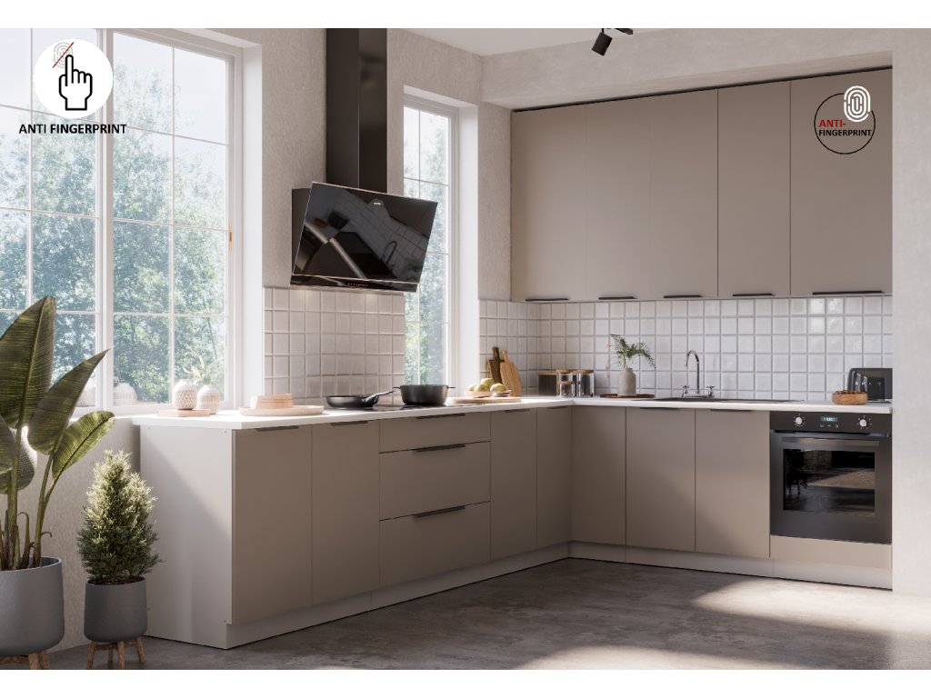 je součástí moderní sektorové kuchyňské linky Aria TA-WH, která je v barevném provedení bílý mat (korpus) a Sandgrau (dvířka). U skříněk s výklopem se dvířka zvedají pomocí plynových pístů, Cargo skříňky jsou výsuvné, všechny ostatní skříňky (mimo rohových) a zásuvky jsou opatřeny SYSTÉMEM TICHÉHO DOVÍRÁNÍ. Úchytky jsou hliníkové černé. Na předních stranách tohoto nábytku (dvířka/zásuvky) má linka speciální povrchovou úpravu Anti Finger Print, nezanechávající otisky prstů.
