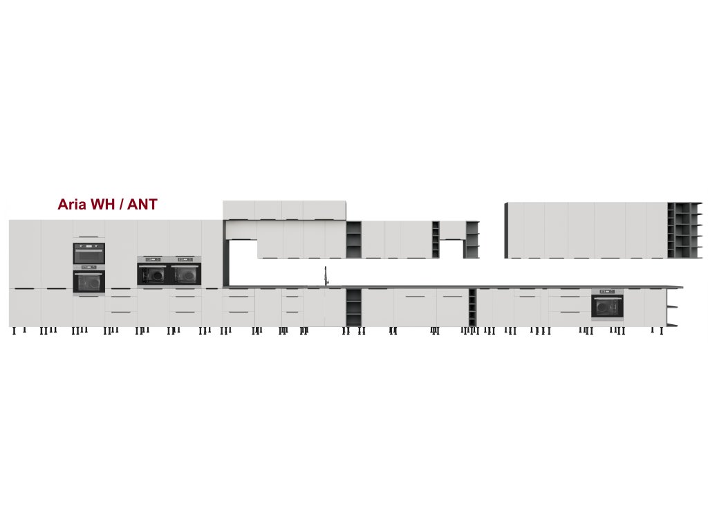 je součástí moderní sektorové kuchyňské linky Aria WH/ANT, která je v barevném provedení Antracit (korpus) a bílý mat (dvířka). Tato linka má atraktivní design díky moderním výškově nastavitelným nožkám a je tak ideální volbou při výběru Vaší kuchyně. U skříněk s výklopem se dvířka zvedají pomocí plynových pístů, Cargo skříňky jsou výsuvné, všechny ostatní skříňky (mimo rohových) a zásuvky jsou opatřeny SYSTÉMEM TICHÉHO DOVÍRÁNÍ. Úchytky jsou hliníkové černé. Na předních stranách tohoto nábytku (dvířka/zásuvky) má linka speciální povrchovou úpravu Anti Finger Print, nezanechávající otisky prstů.