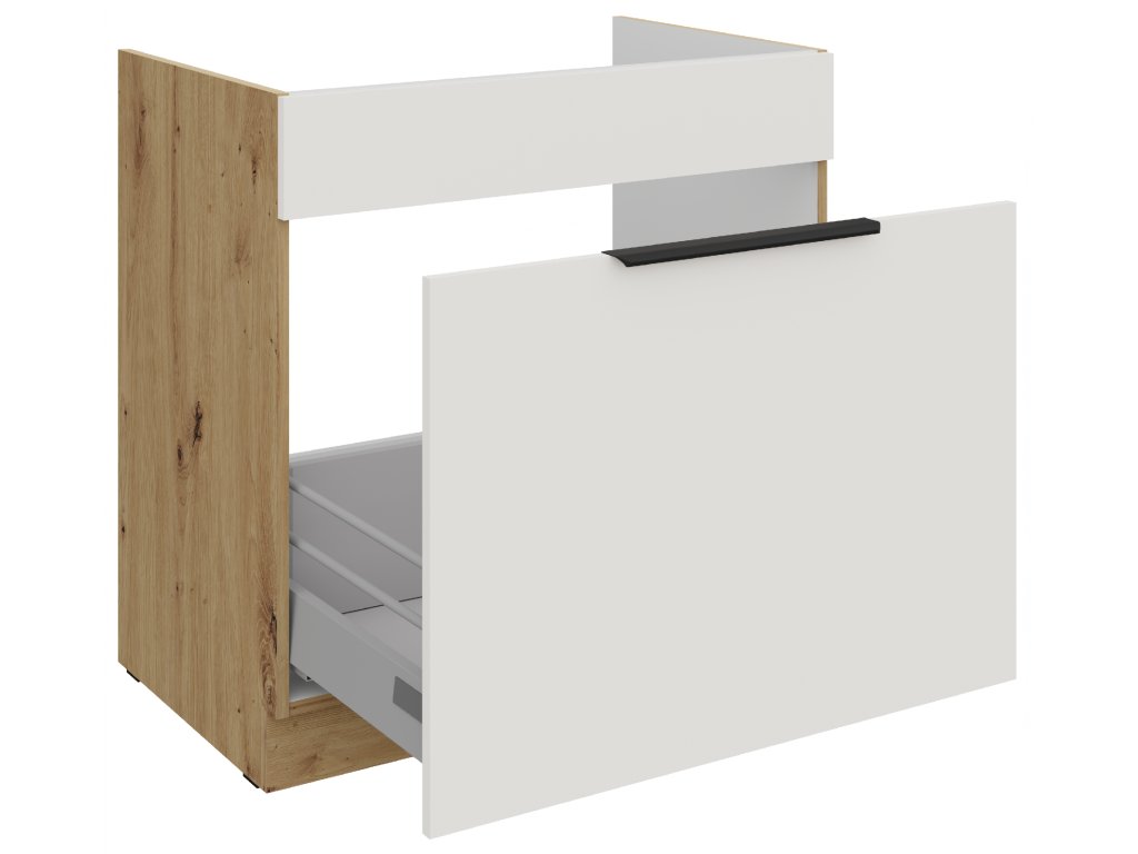 je součástí moderní sektorové kuchyňské linky Aria WH-AR, která je v barevném provedení dub Artisan (korpus) a bílý mat (dvířka). U skříněk s výklopem se dvířka zvedají pomocí plynových pístů, Cargo skříňky jsou výsuvné, všechny ostatní skříňky (mimo rohových) a zásuvky jsou opatřeny SYSTÉMEM TICHÉHO DOVÍRÁNÍ. Úchytky jsou hliníkové černé. Na předních stranách tohoto nábytku (dvířka/zásuvky) má linka speciální povrchovou úpravu Anti Finger Print, nezanechávající otisky prstů.