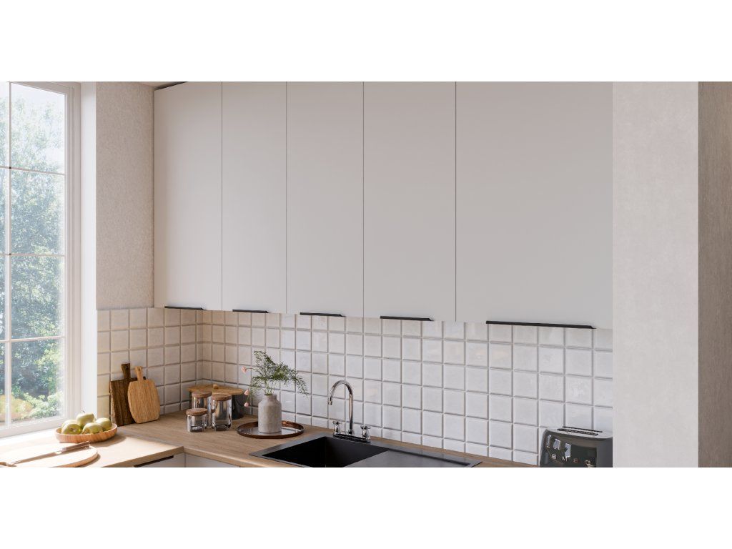 je součástí moderní sektorové kuchyňské linky Aria WH-WH, která je v barevném provedení bílý mat (korpus) a bílý mat (dvířka). U skříněk s výklopem se dvířka zvedají pomocí plynových pístů, Cargo skříňky jsou výsuvné, všechny ostatní skříňky (mimo rohových) a zásuvky jsou opatřeny SYSTÉMEM TICHÉHO DOVÍRÁNÍ. Úchytky jsou hliníkové černé. Na předních stranách tohoto nábytku (dvířka/zásuvky) má linka speciální povrchovou úpravu Anti Finger Print, nezanechávající otisky prstů.