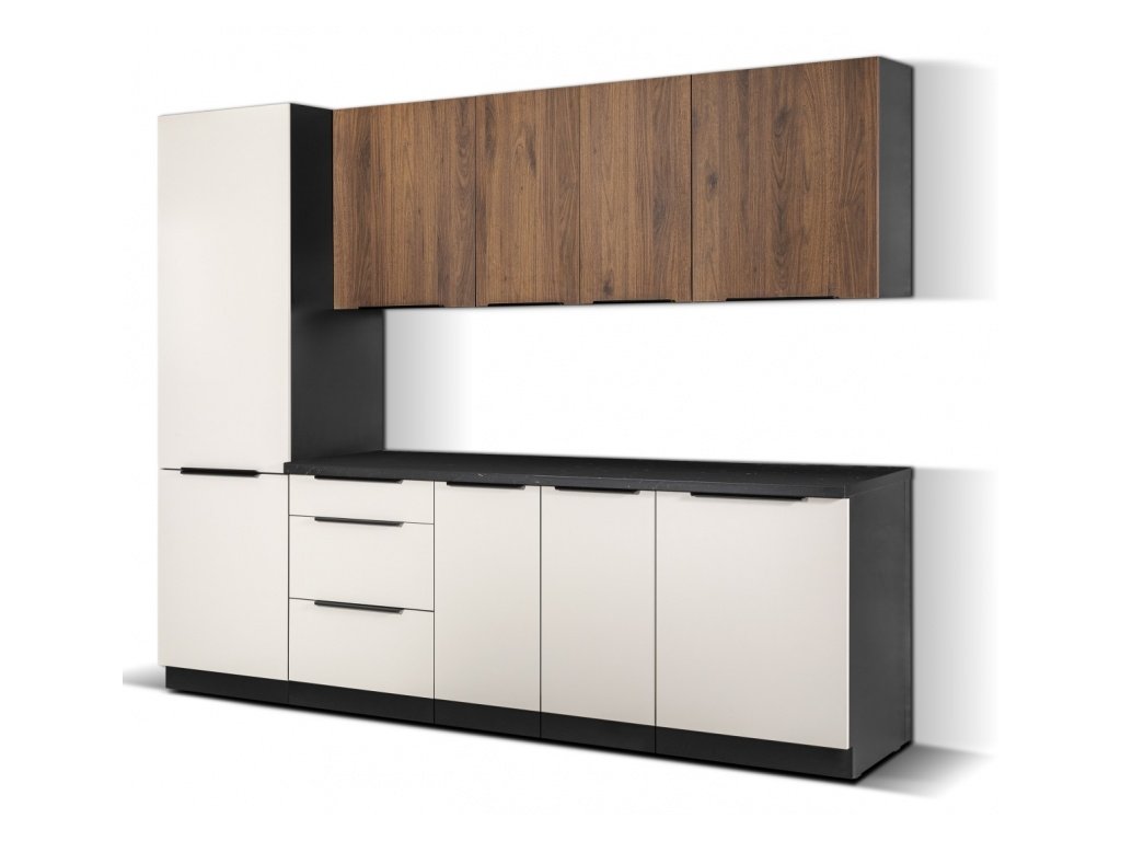 je součástí moderního sektoru kuchyňských linek ARONA, MONZA a SIENA. U těchto linek je vždy korpus v černém matu a pouze dvířka (zásuvky) se mění podle názvu linky - ARONA má přední části v odstínu Cashmere, MONZA v odstínu okapského ořechu a SIENA má jak korpus v černém matu, tak i všechny své přední části. Můžete si tak nakombinovat svojí vysněnou kuchyňskou linku nejen dle svých rozměrů, ale i v různém barevném provedení. Pro inspiraci jsme pro Vás připravili hotové kuchyňské sestavy. Tento nábytek je vyroben z kvalitního lamina 16 mm a zakončený ABS hranou, úchytky jsou černé hliníkové. U skříněk s výklopem se dvířka zvedají pomocí plynových pístů, Cargo skříňky jsou výsuvné, všechny ostatní skříňky (mimo rohových) a zásuvky jsou opatřeny systémem tichého dovírání.