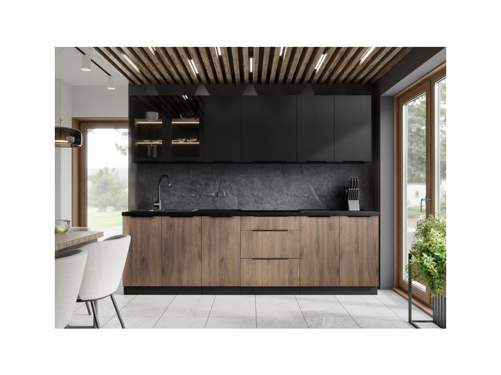 je součástí moderního sektoru kuchyňských linek ARONA, MONZA a SIENA. U těchto linek je vždy korpus v černém matu a pouze dvířka (zásuvky) se mění podle názvu linky - ARONA má přední části v odstínu Cashmere, MONZA v odstínu okapského ořechu a SIENA má jak korpus v černém matu, tak i všechny své přední části. Můžete si tak nakombinovat svojí vysněnou kuchyňskou linku nejen dle svých rozměrů, ale i v různém barevném provedení. Pro inspiraci jsme pro Vás připravili hotové kuchyňské sestavy. Tento nábytek je vyroben z kvalitního lamina 16 mm a zakončený ABS hranou, úchytky jsou černé hliníkové. U skříněk s výklopem se dvířka zvedají pomocí plynových pístů, Cargo skříňky jsou výsuvné, všechny ostatní skříňky (mimo rohových) a zásuvky jsou opatřeny systémem tichého dovírání.