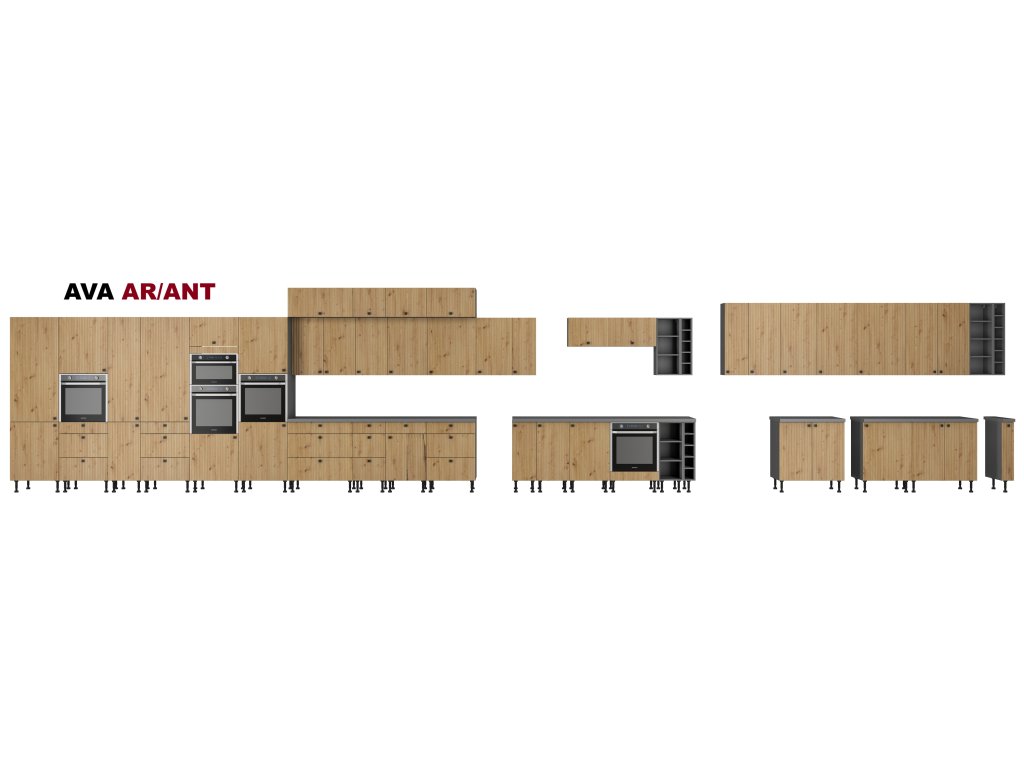 je součástí moderní sektorové kuchyňské linky Ava AR/ANT, která je v barevném provedení Antracit (korpus) a dub Artisan (dvířka). Tato linka má atraktivní design díky moderním výškově nastavitelným nožkám a je tak ideální volbou při výběru Vaší kuchyně. U skříněk s výklopem se dvířka zvedají pomocí plynových pístů, Cargo skříňky jsou výsuvné, všechny ostatní skříňky (mimo rohových) a zásuvky jsou opatřeny SYSTÉMEM TICHÉHO DOVÍRÁNÍ.