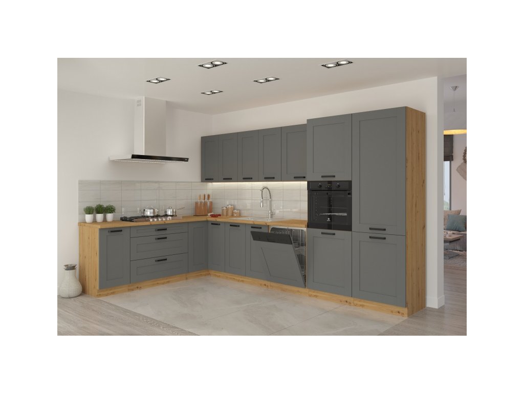je součástí moderní sektorové kuchyňské linky Luna DustGRAR, která je v barevném provedení dub Artisan (korpus) a MDF DustGrey (dvířka s prolisy). Tato linka má atraktivní design a je tak ideální volbou při výběru Vaší kuchyně. U skříněk s výklopem se dvířka zvedají pomocí plynových pístů, Cargo skříňky jsou výsuvné, všechny ostatní skříňky (mimo rohových) a zásuvky jsou opatřeny SYSTÉMEM TICHÉHO DOVÍRÁNÍ. Úchytky jsou kovové.