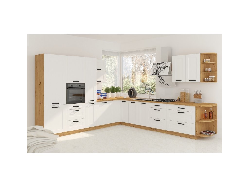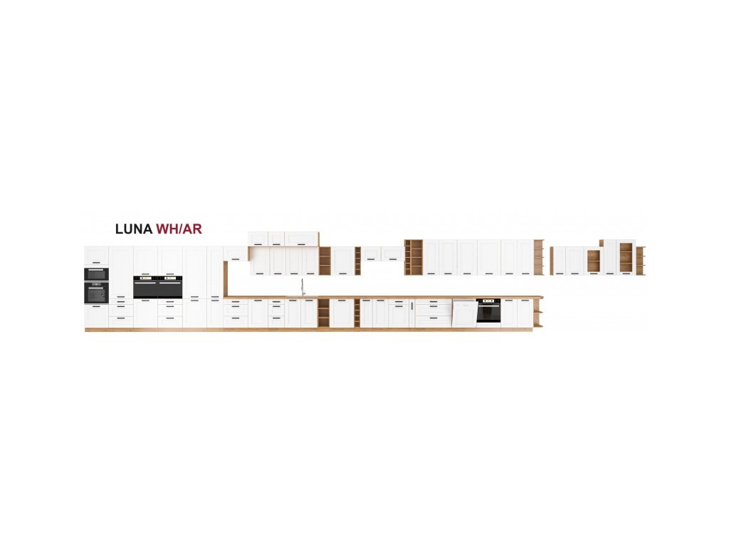 je součástí moderní sektorové kuchyňské linky Luna WHAR, která je v barevném provedení dub Artisan (korpus) a MDF bílá (dvířka s prolisy). Tato linka má atraktivní design a je tak ideální volbou při výběru Vaší kuchyně. U skříněk s výklopem se dvířka zvedají pomocí plynových pístů, Cargo skříňky jsou výsuvné, všechny ostatní skříňky (mimo rohových) a zásuvky jsou opatřeny SYSTÉMEM TICHÉHO DOVÍRÁNÍ. Úchytky jsou kovové.