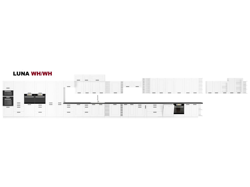 je součástí moderní sektorové kuchyňské linky Luna WHWH, která je v barevném provedení bílý mat (korpus) a MDF bílá (dvířka s prolisy). Tato linka má atraktivní design a je tak ideální volbou při výběru Vaší kuchyně. U skříněk s výklopem se dvířka zvedají pomocí plynových pístů, Cargo skříňky jsou výsuvné, všechny ostatní skříňky (mimo rohových) a zásuvky jsou opatřeny SYSTÉMEM TICHÉHO DOVÍRÁNÍ. Úchytky jsou kovové.