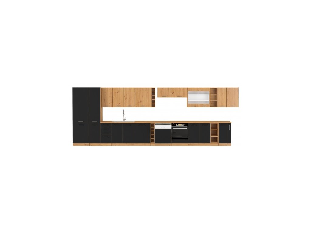 je součástí moderní sektorové kuchyňské linky Modena, která je v barevném provedení dub Artisan (korpus + dvířka u horních skříněk) a černý mat (dvířka u dolních skříněk). Tato linka má atraktivní design a je tak ideální volbou při výběru Vaší kuchyně. U skříněk s výklopem se dvířka zvedají pomocí plynových pístů, Cargo skříňky jsou výsuvné, všechny ostatní skříňky (mimo rohových) a zásuvky jsou opatřeny SYSTÉMEM TICHÉHO DOVÍRÁNÍ. Úchytky jsou kovové.