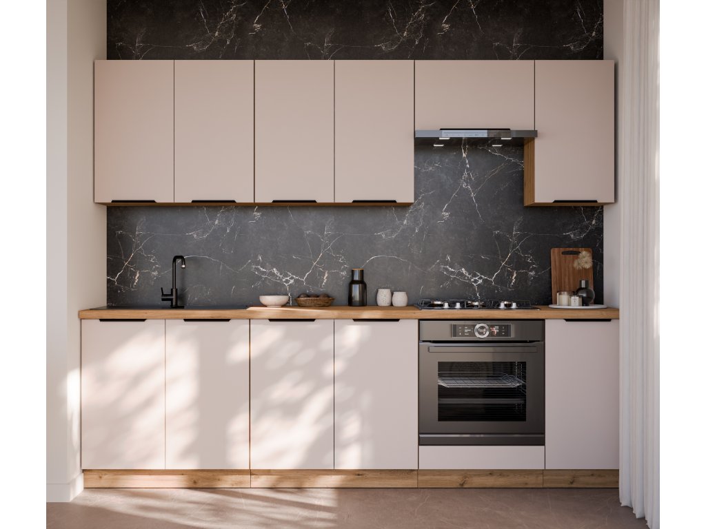 je součástí moderní sektorové kuchyňské linky Solea, která je v barevném provedení dub Artisan (korpus) a Cashmere (dvířka). Tato linka má atraktivní design a je tak ideální volbou při výběru Vaší kuchyně. U skříněk s výklopem se dvířka zvedají pomocí plynových pístů, Cargo skříňky jsou výsuvné, všechny ostatní skříňky (mimo rohových) a zásuvky jsou opatřeny SYSTÉMEM TICHÉHO DOVÍRÁNÍ. Úchytky jsou černé hliníkové.