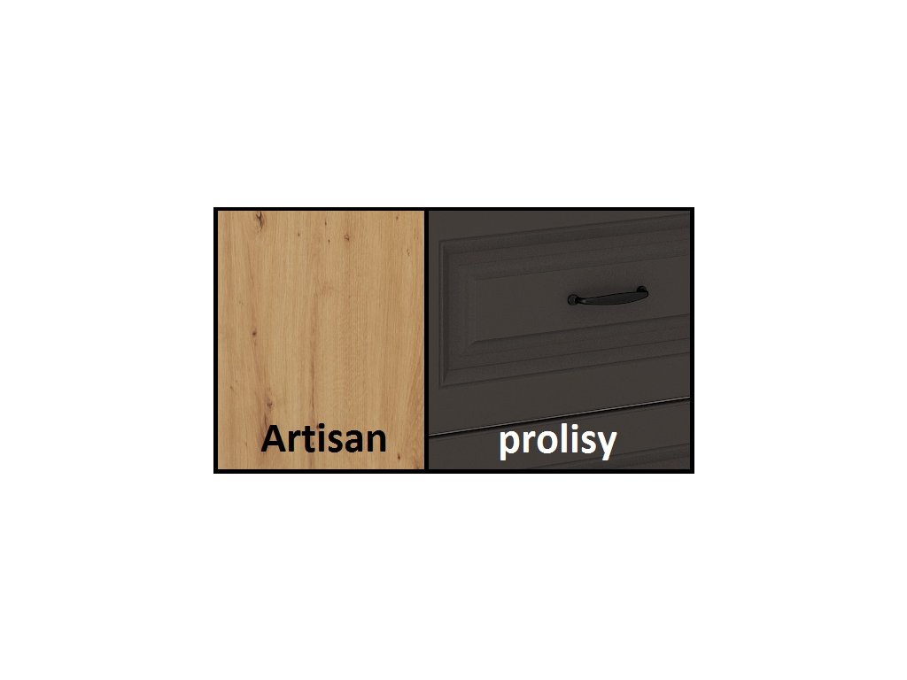 je součástí moderní sektorové kuchyňské linky Stilo GRAR, která je v barevném provedení dub Artisan (korpus) a MDF Grafit mat (dvířka s prolisy). Tato linka má atraktivní design a je tak ideální volbou při výběru Vaší kuchyně. U skříněk s výklopem se dvířka zvedají pomocí plynových pístů, Cargo skříňky jsou výsuvné, všechny ostatní skříňky (mimo rohových) a zásuvky jsou opatřeny SYSTÉMEM TICHÉHO DOVÍRÁNÍ. Úchytky jsou kovové.