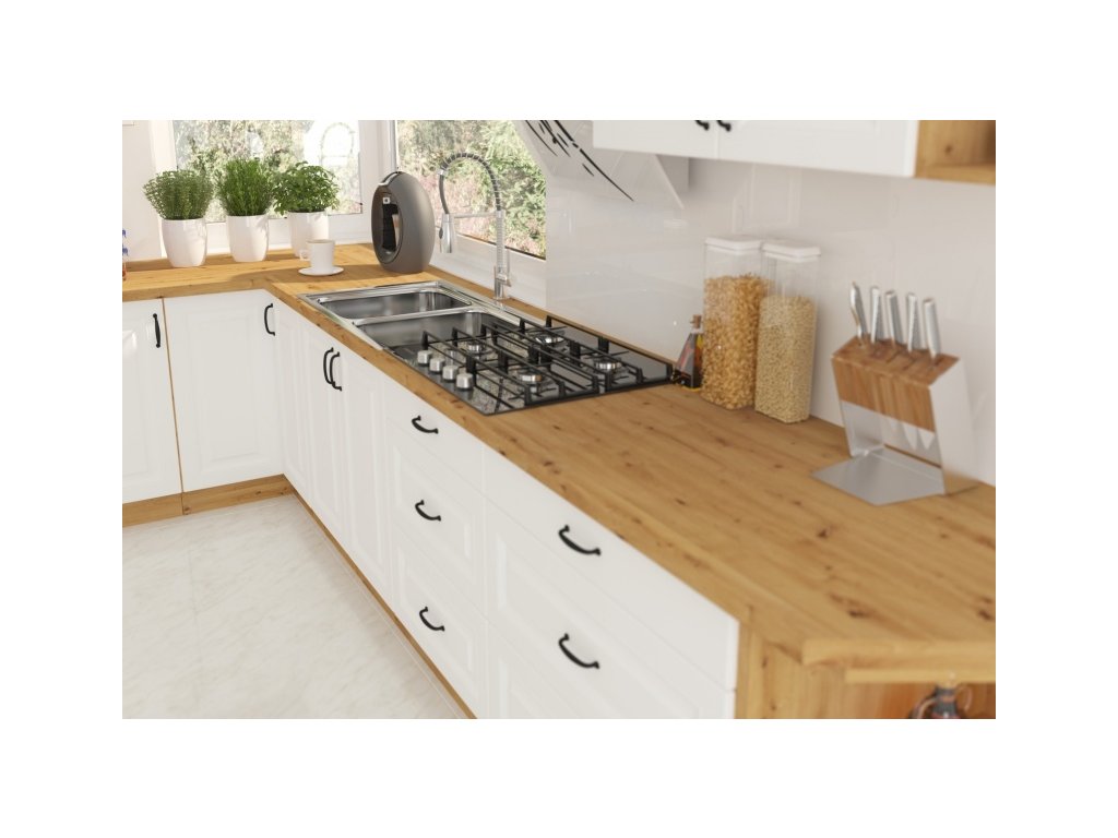 je součástí moderní sektorové kuchyňské linky Stilo WHAR, která je v barevném provedení dub Artisan (korpus) a MDF bílý mat (dvířka s prolisy). Tato linka má atraktivní design a je tak ideální volbou při výběru Vaší kuchyně. U skříněk s výklopem se dvířka zvedají pomocí plynových pístů, Cargo skříňky jsou výsuvné, všechny ostatní skříňky (mimo rohových) a zásuvky jsou opatřeny SYSTÉMEM TICHÉHO DOVÍRÁNÍ. Úchytky jsou kovové.
