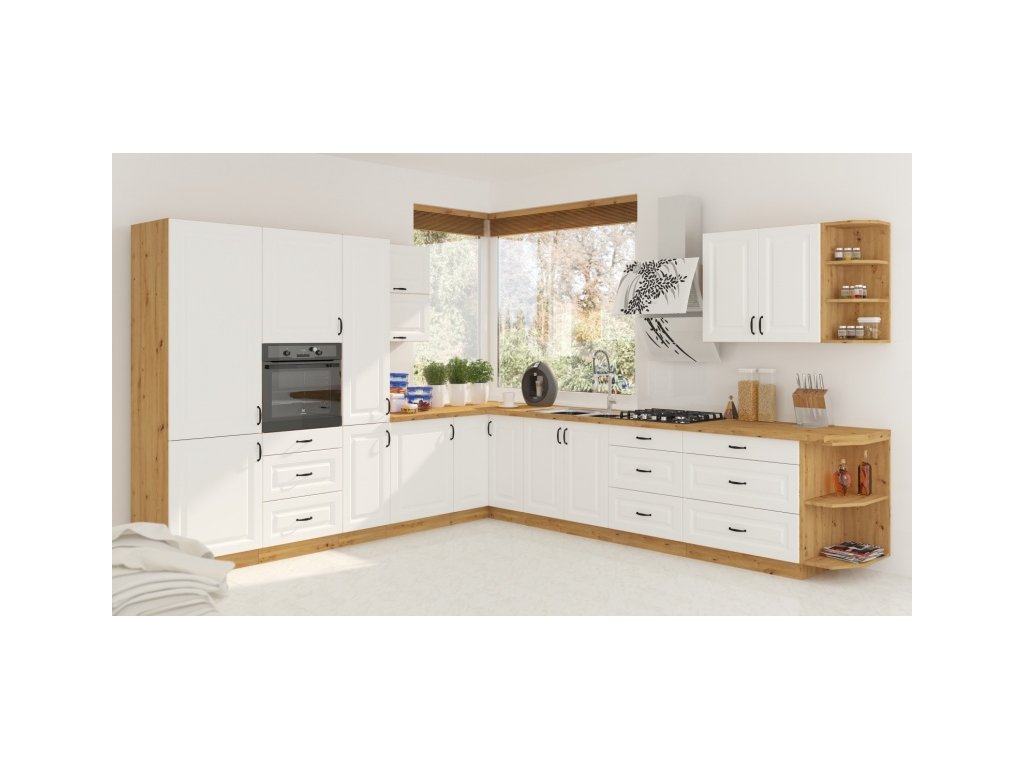 je součástí moderní sektorové kuchyňské linky Stilo WHAR, která je v barevném provedení dub Artisan (korpus) a MDF bílý mat (dvířka s prolisy). Tato linka má atraktivní design a je tak ideální volbou při výběru Vaší kuchyně. U skříněk s výklopem se dvířka zvedají pomocí plynových pístů, Cargo skříňky jsou výsuvné, všechny ostatní skříňky (mimo rohových) a zásuvky jsou opatřeny SYSTÉMEM TICHÉHO DOVÍRÁNÍ. Úchytky jsou kovové.