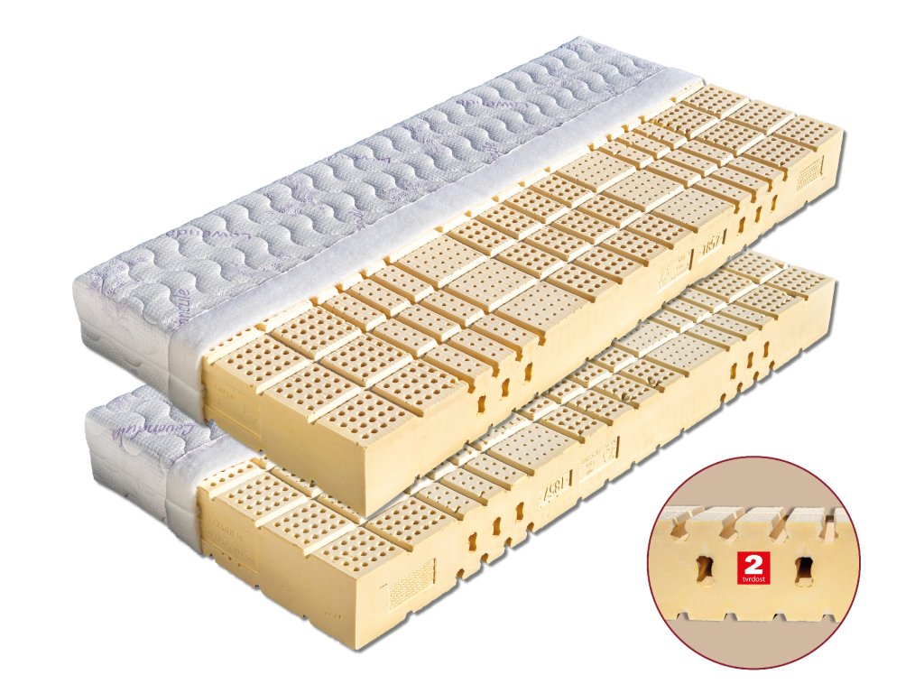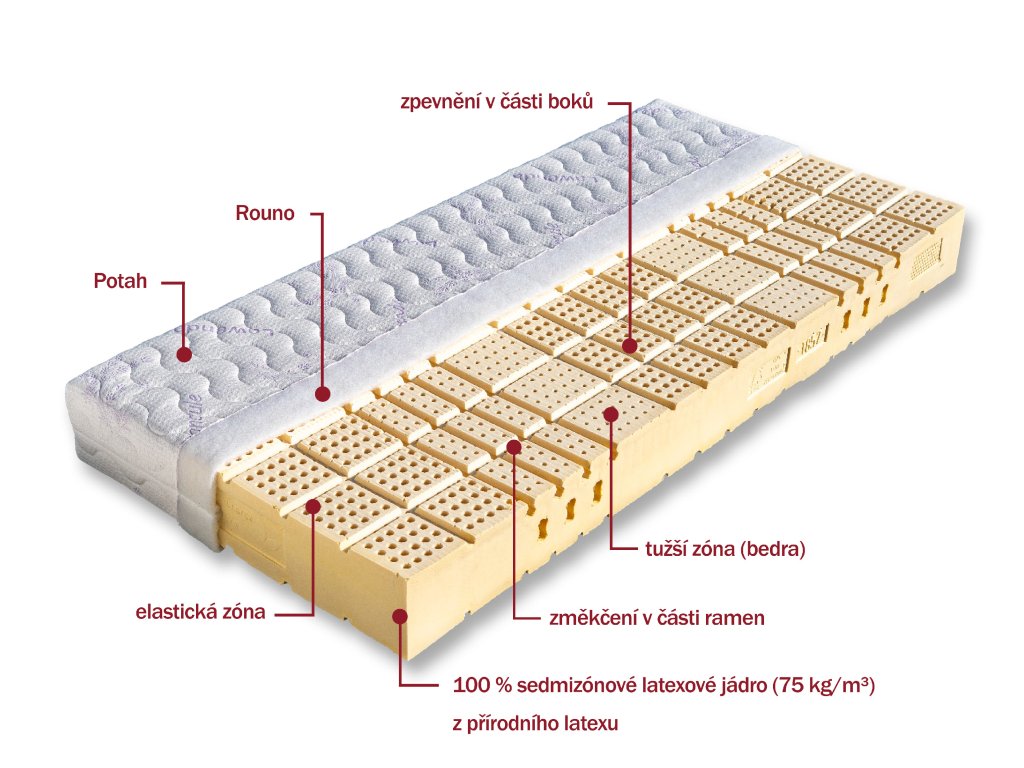 Luxusní latexová matrace vyrobená ze 100 % přírodního latexu se jemně přizpůsobí tělu. Je měkká, elastická a velmi pohodlná, ideální pro ty, kteří preferují měkčí matrace. Navržená podle nejnovějších ergonomických a komfortních standardů. Matrace podporuje přirozenou polohu páteře, přizpůsobuje se individuálním křivkám těla a zajišťuje maximální pohodlí po celou noc. Důmyslný antidekubitní tvar ložných ploch matrace vytváří anatomické zóny, které jsou obzvlášť patrné pod rameny, kde tvoří tzv. ramenní kolébku. Odolné přírodní latexové jádro s vysokou hustotou 75 kg/m³ zaručuje dlouhodobou životnost matrace a předurčuje ji zákazníkům s nejvyššími nároky na kvalitní spaní. Je vhodná pro všechny věkové kategorie, ocení ji lidé se zvýšenou péčí o klouby. Větrací otvory zajišťují optimální cirkulaci vzduchu a efektivně odvádějí vlhkost. Udržují v matraci tzv. suché klima eliminující mikroorganismy.