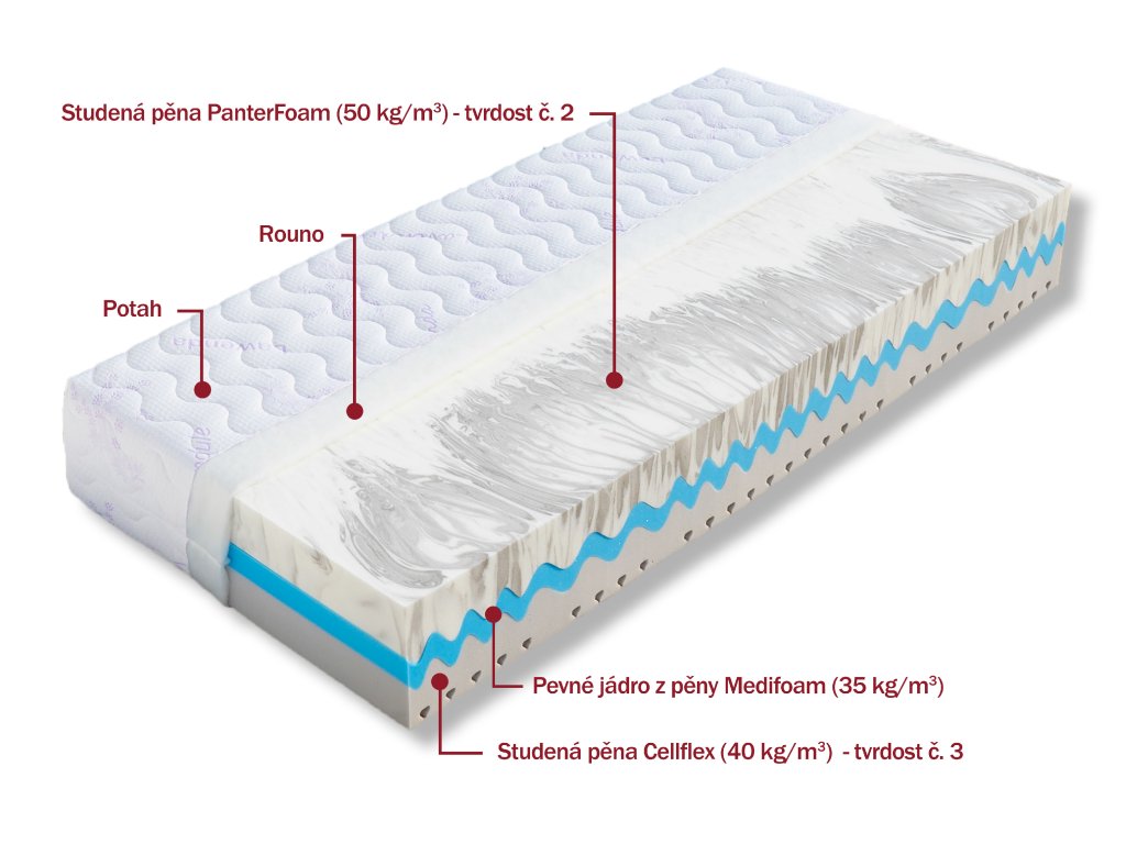 Matrace s komfortní výškou 25 cm, která vyniká svojí odolností a dlouhou životností. Poddajnější stranu matrace tvoří pěna PanterFoam (50 kg/m³), která přináší to nejlepší pro Váš spánek. Hlavní předností této pěny je její výjimečná elasticita a skvělá prodyšnost. Je velmi pohodlná a její vlastnosti jsou stálé i po mnoha letech užívání. Její vyšší hustota zaručí nadstandardní odolnost. Střed jádra matrace je vyztužen tvrzenou pěnou MediFoam (35 kg/m³) v důmyslném vlnkovitém tvaru, díky kterému se matrace dokonale přizpůsobí křivkám Vašeho těla. Druhou, pevnější stranu matrace s ventilačními průřezy tvoří špičková pěna Cellflex (40 kg/m³), která je tou pravou podporou těla. Reguluje obsah vlhkosti a tepla v matraci, je pružná a díky své vysoké hustotě velmi odolná. Má jemnou otevřenou buněčnou strukturu, která zajišťuje vynikající rozložení tlaku na matraci.