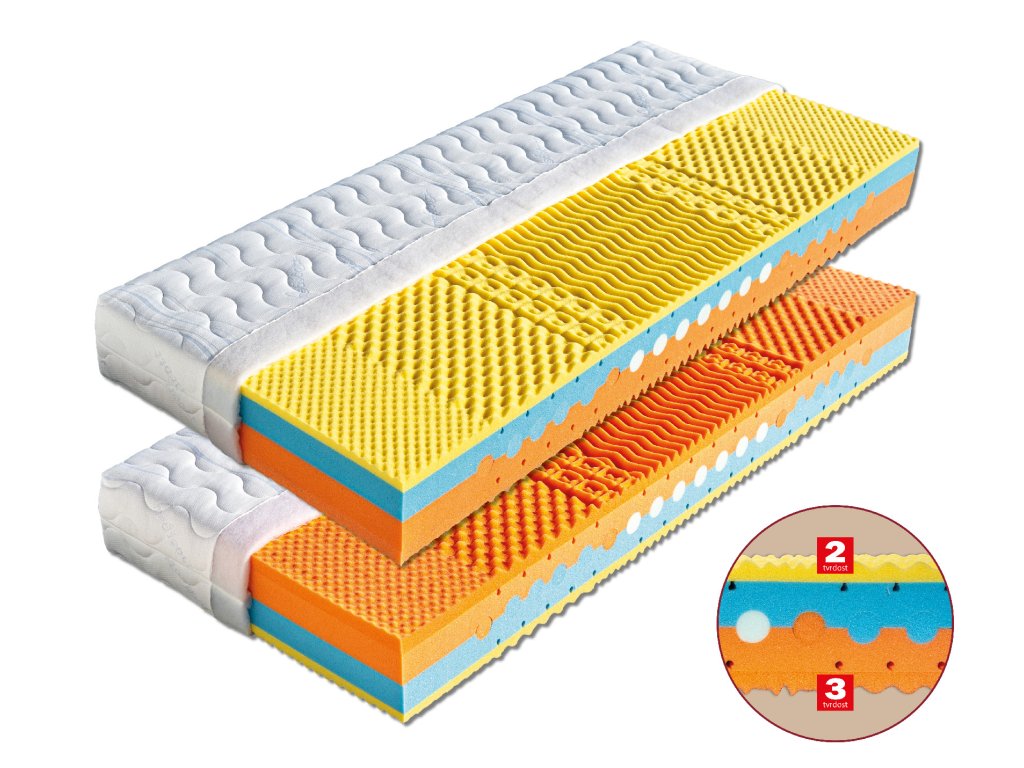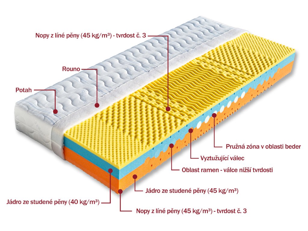 Luxusní matrace s provzdušněným jádrem ze studené pěny dvou tuhostí (40 a 45 kg/m³) a s vloženými válci ze studených pěn různých tuhostí (pod rameny nižší tuhosti, pod bedry vyšší). Oboustranná matrace, kde obě vrchní vrstvy tvoří viscoelastická pěna (45 kg/m³), která reaguje na tělesné teplo a přizpůsobuje se konturám těla spáče. To snižuje tlak na nejtěžší části těla a vytváří pocit beztíže. Ke zvýšení komfortu přispívá také tvarování pěny do masážních nopů zabezpečujících prokrvení pokožky a uvolnění svalů během spánku. Sedmizónové rozdělení nopů je důležité i ze zdravotního hlediska. Zatímco pod rameny oceníte měkčí zóny, pod bedry je potřeba mít pevnější podklad. Matraci je vhodné položit na pevný nebo polohovací lamelový rošt. Klinicky testováno.