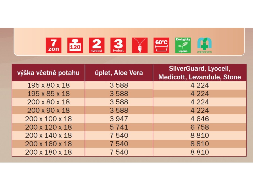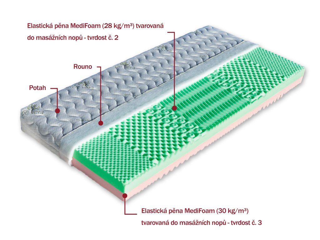 Sedmizónová matrace s volbou dvojí tvrdosti je složena ze dvou vysoce kvalitních elastických pěn MediFoam (28 a 30 kg/m³) tvarovaných do masážních nopů. Nopy zabezpečují prokrvení pokožky a uvolnění svalů během spánku a nadzvedávají potah, čímž dochází k lepšímu provzdušnění matrace. Matrace se vyznačuje výbornou elasticitou a odolností. Je určena pro širokou škálu uživatelů a je vhodná na všechny typy roštů.