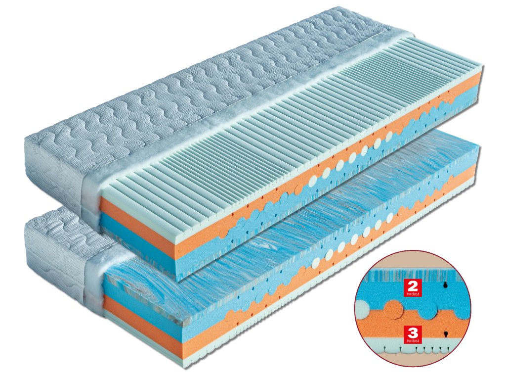 Kvalitní oboustranná matrace s provzdušněným jádrem ze studené pěny dvou tvrdostí (40 a 45 kg/m³) a s vloženými válci ze studených pěn různých tuhostí (pod rameny nižší tuhosti, pod bedry vyšší). Strana s tvrdostí č. 3 je tvořena vysoce gramážní pěnou MediFoam (32 kg/m³). Je tvarovaná do masážních vlnek, tzv. panáčků, v pěti zónách. Druhou nosnou vrstvu (tvrdost č. 2) tvoří extrémně prodyšná studená / HR pěna PanterFoam Nautic (50 kg/m³). Díky vysoké hustotě je odolná a trvanlivá. Zaručuje stálou kvalitu po mnoho let. Je velmi elastická a pohodlná. Má navíc speciální antibakteriální úpravu, která poskytuje trvalou a účinnou ochranu proti bakteriím, roztočům a plísním. Matraci je vhodné položit na pevný nebo polohovací lamelový rošt. Celková výška matrace cca 22 cm.