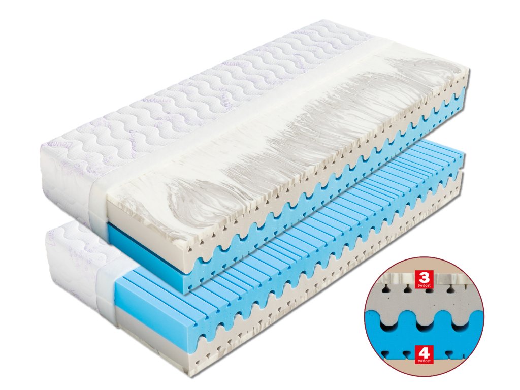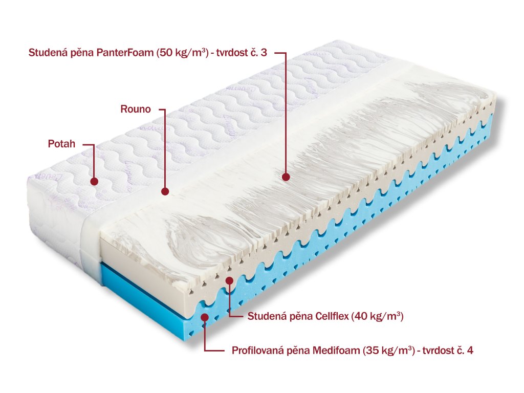 Pevnější matrace se špičkovou pěnou Cellflex (40 kg/m³), která je díky vysoké hustotě velmi odolná a zaručí dlouhou životnost Vaší matrace. Její zářezy v exponovaných místech přispívají k dokonalé opoře ležícího těla (pod rameny a boky se více prohne a odpruží). Pěna Cellflex je doplněna poddajnější pěnou PanterFoam ve výšce 3cm (50 kg/m³), která je velmi vzdušná a elastická, proto tvoří měkčí stranu této matrace (tvrdost č. 3). Naproti tomu pevnější strana (tvrdost č. 4) je tvořena vysoce gramážní modrou pěnou MediFoam (35 kg/m³), která i při vyšší hustotě optimalizuje rozložení tlaku na matraci. Na jejím povrchu najdete speciální ventilační zářezy. Jádro matrace je provzdušněné vlnkovitým prořezem, důležitým pro větší prodyšnost matrace a dokonalou spolupráci obou pěn.