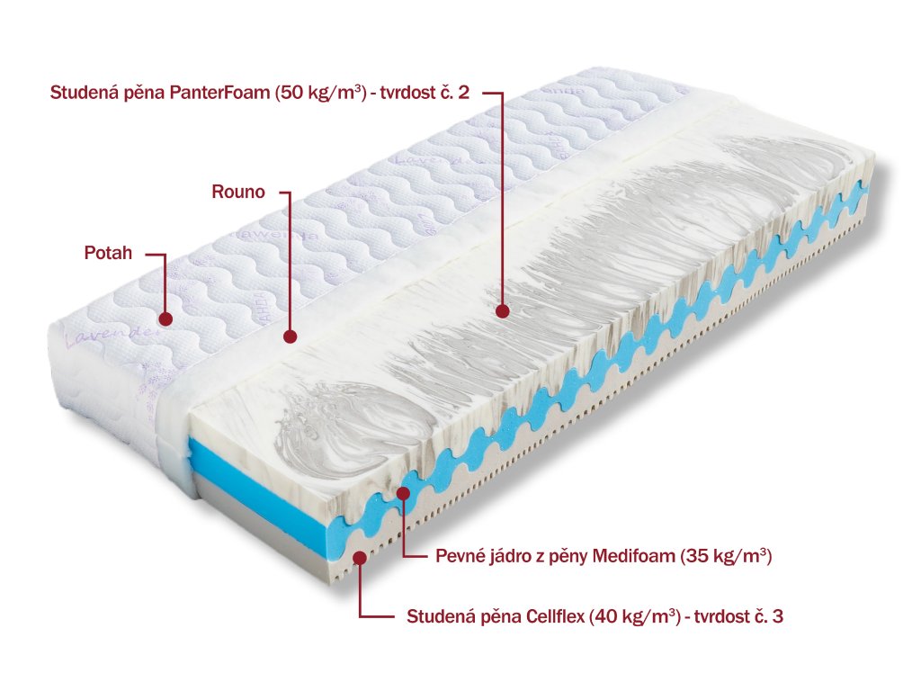 Partnerská matrace z velmi kvalitních pěn PanterFoam a Cellflex, které se vyznačují dlouhou životností. Vrchní strana je tvořena značkovou pěnou PanterFoam (50 kg/m³), která přináší to nejlepší pro Váš spánek. Její vysoká hustota zabezpečí nadstandardní odolnost. Pevné jádro z MediFoam pěny (35 kg/m³) je tvarováno do souměrných vlnek, aby se mohlo přizpůsobit ležícímu tělu. U tvrdší strany matrace oceníte špičkovou kvalitu pěny Cellflex (40 kg/m³). Tato velmi odolná pěna je charakteristická svojí otevřenou buněčnou strukturou, díky které výborně reguluje vlhkost a teplo v matraci. V kombinaci se studenou pěnou PanterFoam tvoří pár dokonale spolupracujících pěn. Matrace je vhodná pro všechny typy roštů.