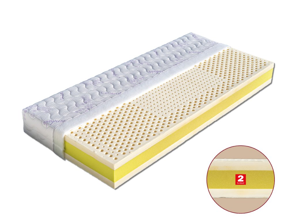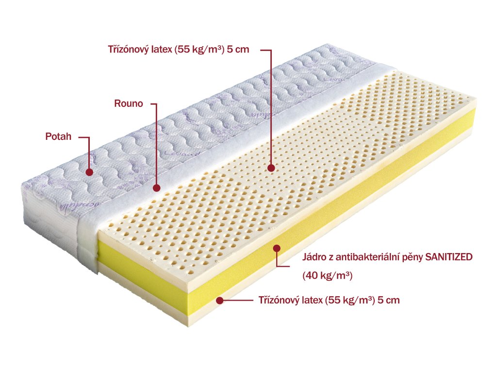 Jádro matrace je složeno ze dvou třízónových latexových desek tloušťky 5 cm (55 kg/m³) a antibakteriálního jádra (40 kg/m³) s úpravou Sanitized, která poskytuje trvalou a účinnou ochranu před mikroorganismy. Díky svým ortopedickým vlastnostem je vhodná pro všechny věkové kategorie, ocení ji alergici i lidé se zvýšenou péčí o klouby. Výborně se přizpůsobuje tvaru těla a přináší maximální pohodlí po celou dobu spánku. Větrací otvory zajišťují optimální cirkulaci vzduchu a efektivně odvádějí vlhkost. Matrace je vhodná na všechny typy lamelových roštů.