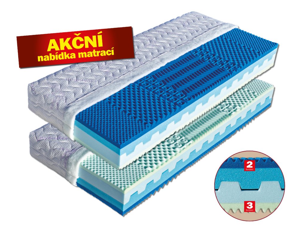 Vrchní modrá vrstva je tvořena viscoelastickou pěnou (50 kg/m³). Tato pěna Vám zajistí optimální rozložení váhy těla na matraci. Provzdušněné jádro s příčnými průduchy je složené z vrstvy extra prodyšné studené HR pěny (40 kg/m³) s dokonalou elasticitou a z tvrzené elastické pěny MediFoam (35 kg/m³). Druhou vrchní vrstvu tvarovanou do masážních nopů tvoří pěna MediFoam (32 kg/m³). Je vhodná pro všechny typy roštů.