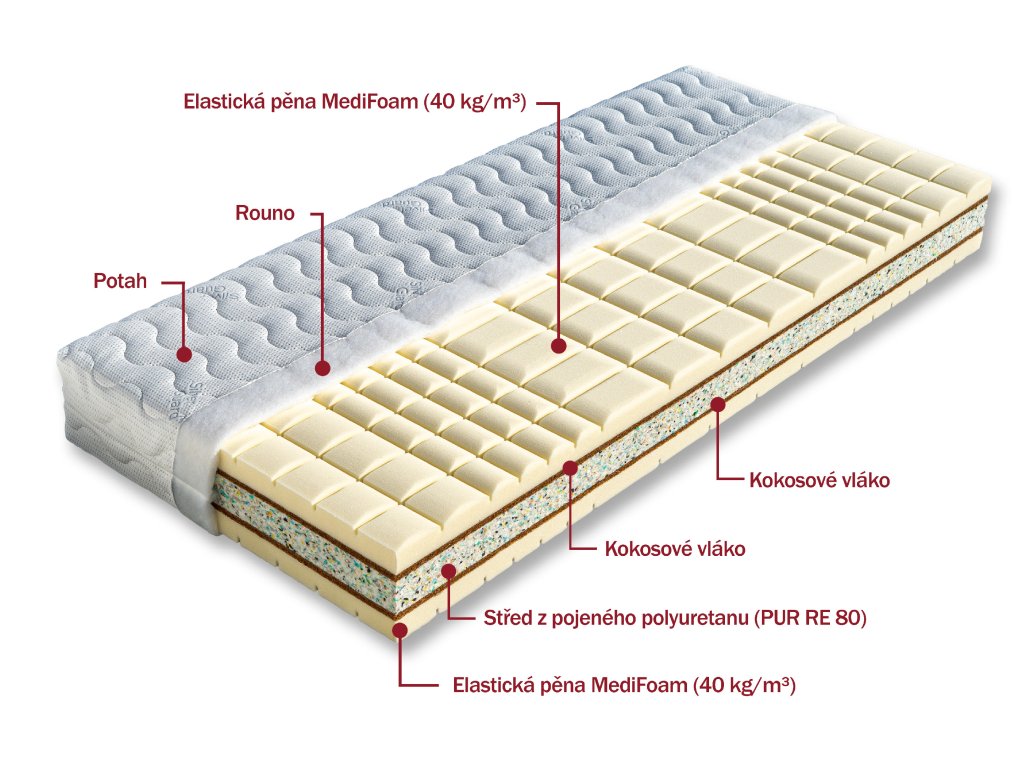 Tato pevná sendvičová matrace snese vysoké zatížení, a to až do váhy 160 kg. Střed jádra je tvořen plotnou pojeného polyuretanu (PUR RE 80) ve výšce 7 cm. Nosné vrstvy ze dvou vysoce kvalitních elastických pěn MediFoam (40 kg/m³) jsou podloženy vrstvou kokosového vlákna ve výšce 1,5 cm, které napomáhá zpevnění a provzdušnění matrace. Nosné vrstvy jsou ideálně odlehčené speciálním podélným a příčným průřezem zaručujícím optimální pohodlí pro každou část těla. Tato matrace je vhodná jen pro nepolohovací rošty.