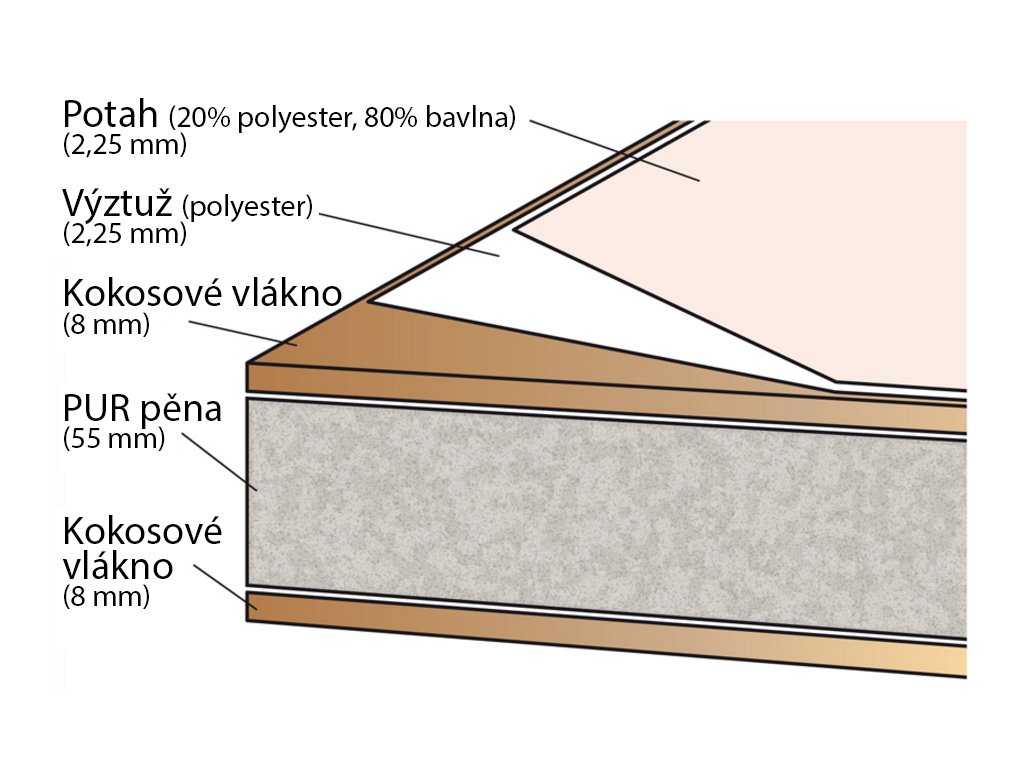 Kokosové vlákno + PUR pěna + kokosové vlákno