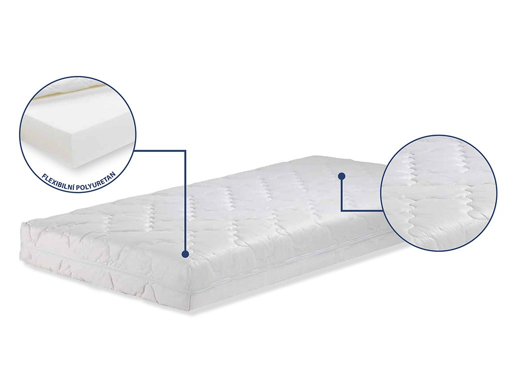 Matrace s jádrem z polyuretanové pěny a bavlněným potahem, který poskytuje příjemnou měkkost na dotek. Potah je elegantně prošívaný.