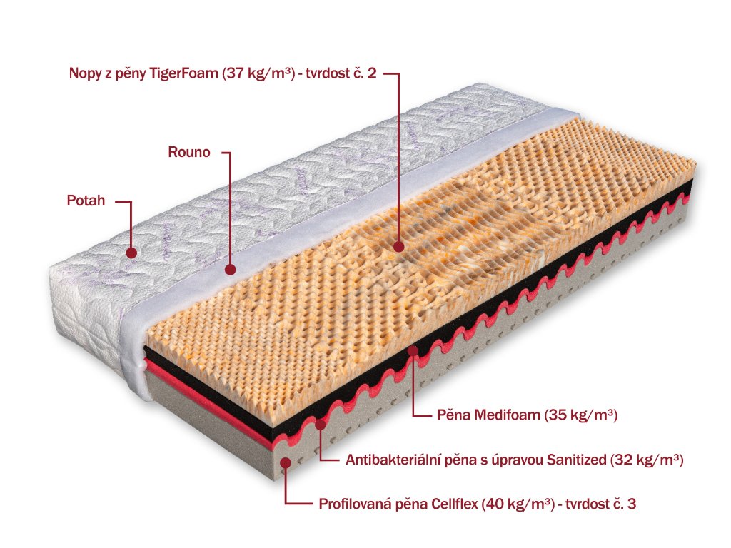 Exkluzivní matrace s volbou dvojí tvrdosti je složená z jedinečných komfortních pěn s vysokou hustotou. Měkčí stranu (tvrdost č. 2) tvoří speciální studená pěna TigerFoam (37 kg/m³) tvarovaná do nopů, která je známá svou prodyšností, odolností a elasticitou, podobnou latexu. Struktura otevřených buněk zajišťuje nepřetržitou cirkulaci vzduchu, účinně odpařuje vlhkost a vytváří svěží, hygienické prostředí pro spánek. U tvrdší strany matrace (tvrdost č. 3) oceníte špičkovou kvalitu studené pěny Cellflex (40 kg/m³), která je díky své vysoké hustotě velmi odolná a dokonale se přizpůsobí tvaru těla. Tato strana je opatřena provzdušňujícími kanálky. Střední část jádra je vyztužena antibakteriální pěnou Sanitized (32 kg/m³) a pěnou MediFoam (35 kg/m³). Tato výjimečná matrace je vhodná na všechny typy roštů.