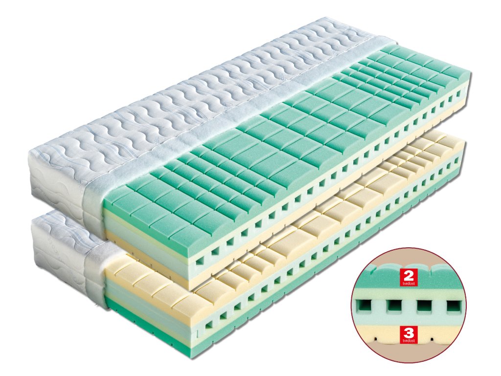 Matrace s jádrem s unikátně provzdušněným řezem. Tento zákazníky časem prověřený profil je složen z tvrzené pěny MediFoam s vysokou gramáží (40 kg/m³). Vrchní a spodní vrstvu tvoří pěny MediFoam (35 a 40 kg/m³). Mají antidekubitní prořez a celkově tuto plochu výborně provzdušňují. Tyrkysová pěna je poddajnější a má tvrdost č. 2. Pouhým otočením matrace získáte pevnější stranu se slonově bílou odolnou pěnou, tvrdost č. 3. Tuto matraci je díky řezu vhodné uložit i na neprodyšnou pevnou desku. Je vhodná pro všechny typy roštů, včetně polohovacích.