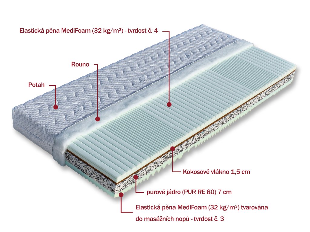 Sendvičová matrace s vynikajícími ortopedickými vlastnostmi. Střed jádra je tvořen pojeným polyuretanem (PUR RE 80) ve výšce 7 cm a kokosovou vrstvou ve výšce 1,5 cm, která lépe provzdušní střed matrace. Nosná vrstva pěny MediFoam (32 kg/m³) zabezpečuje dokonalé odvětrání díky speciálnímu řezu ve tvaru tzv. panáčků, které jsou vytvarovány do zón podle tvaru ležícího těla. Druhou stranu matrace tvoří pěna MediFoam (32 kg/m³) tvarovaná do masážních nopů. Tato matrace snese vysoké zatížení, a to až do váhy 150 kg. Nedoporučuje se na motorové rošty.